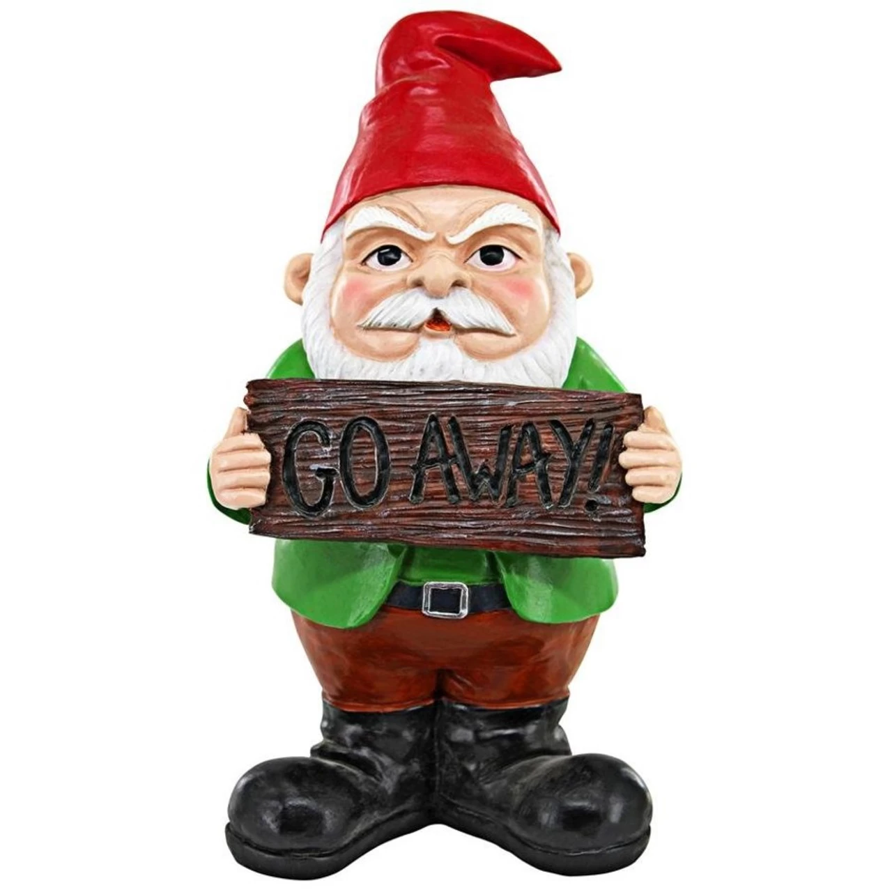 Know anyone with their knickers in a twist like our garden gnome? Whether our annoyed elf is bent out of shape at all the gnome-arazzi taking flowerbed photos or at the too-precious pups using his lawn as a potty, this bad attitude gnome still manages to send the “Go Away” message loud and clear! Imaginatively sculpted from pointy red hat to white gnome beard, our quality designer resin garden gnome statue is hand painted one-piece-at-a-time as a great collectible and a DT exclusive gift!
