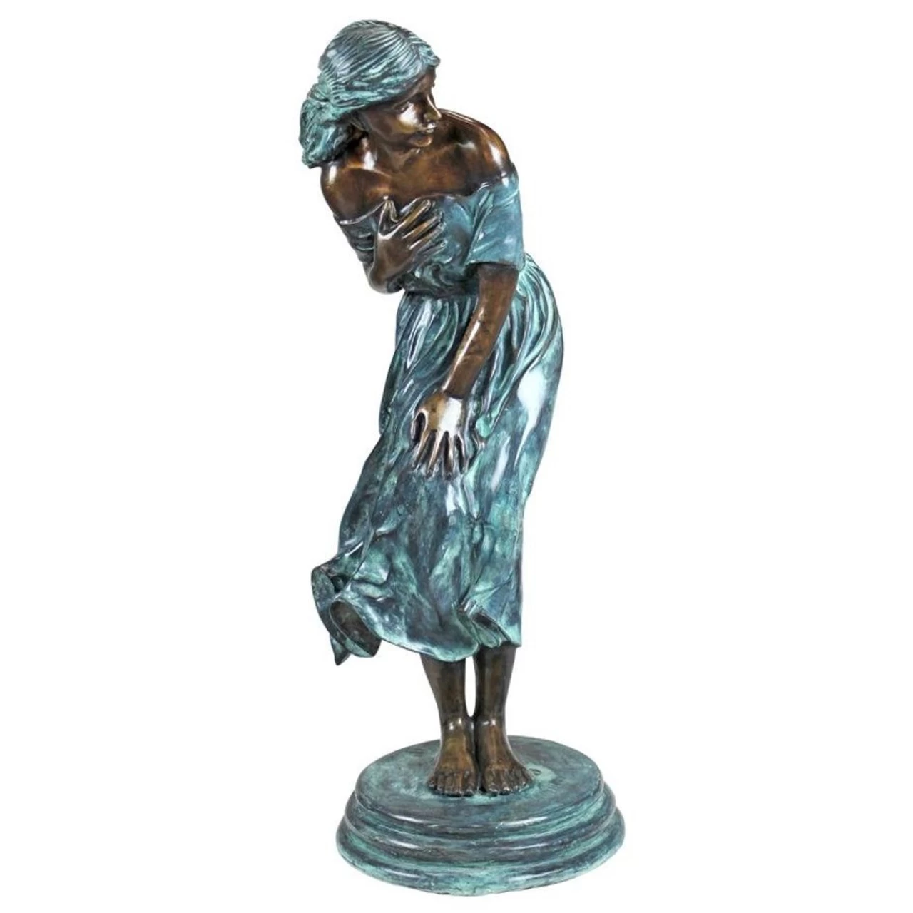 Add style and beauty to almost any setting with this bronze sculpture by Frenchman Leon Pilet (1836-1916), winner of the prestigious Grand Prix de Rome and the Medal of Honor. “Windblown” (1888) is exquisitely detailed from the drape of fabric to the arch of her bare shoulders to her delicate feet. Our bronze maiden statue is expertly finished with a hand-applied multidimensional emerald verde bronze patina. The alluring female sculpture is individually cast in the traditional lost wax method, which highlights her expressive face and exquisite, serpentined torso position and guarantees lasting beauty. Sure to be a focal point, this Design Toscano exclusive heirloom-quality bronze garden statue conveys that you take the exterior of your home as seriously as the interior.