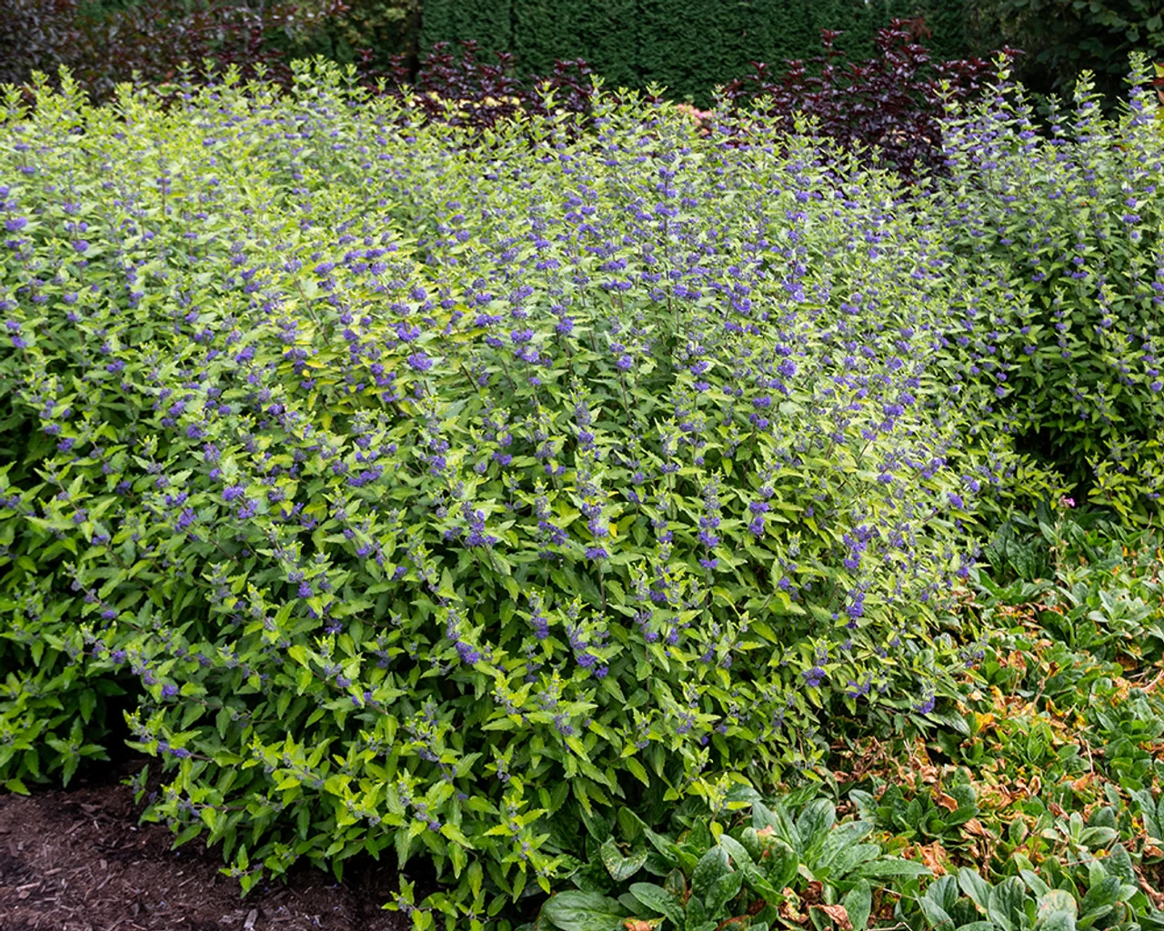 Caryopteris x Clandonensis keeps to a small 2 foot by 2 foot size. Spacing is important to keep good air flow around the plants. In the ground the plants should have 24 inches, on center spacing, to allow for good branch formation.