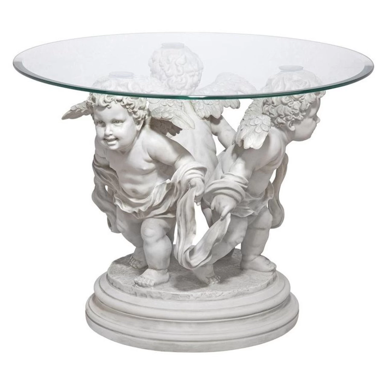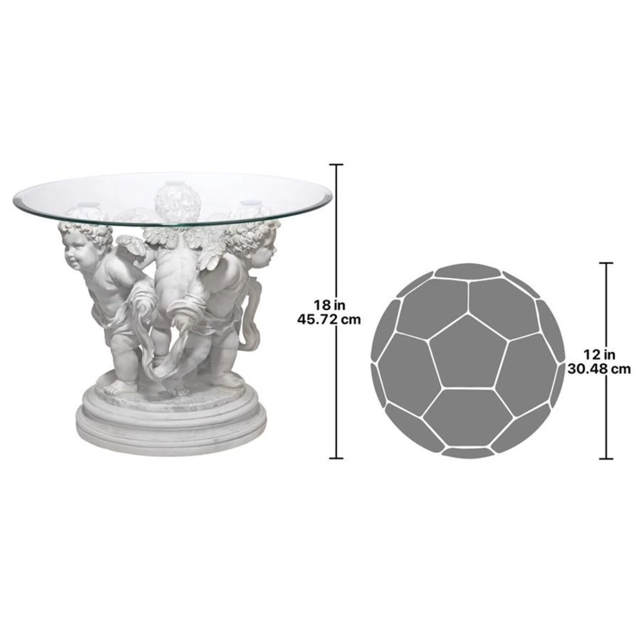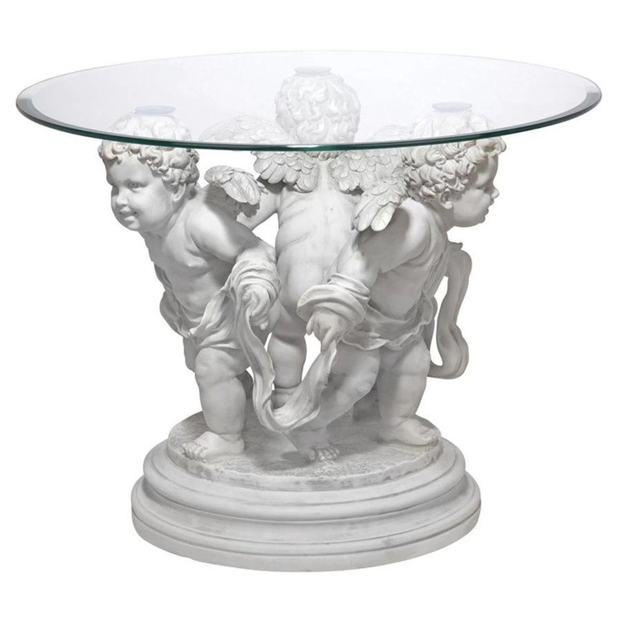 Echoing Bernini’s famous Italian-style fountains, our trio of cherubs dances in this artistic synergy of style and function. The 360-degree sculpt, beautiful from any angle, is cast in quality designer resin finished to replicate aged stonework. This Toscano exclusive is displayed beneath a 24″ diameter, 1/2 -thick, bevel-edged glass top.