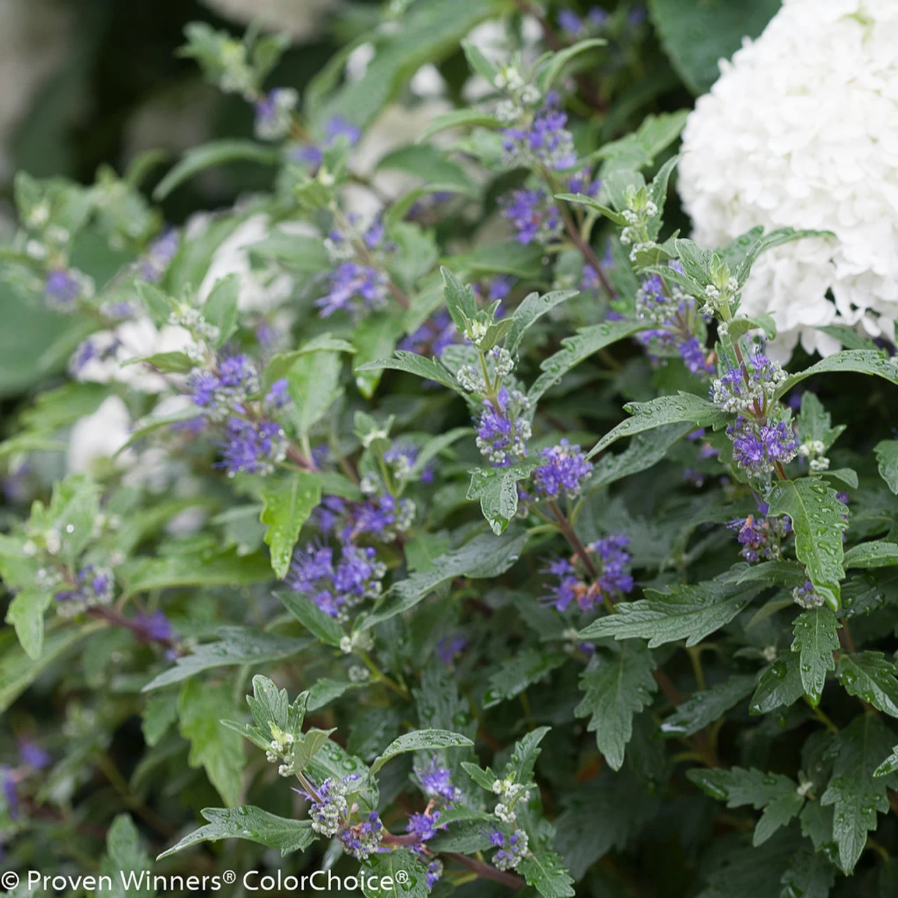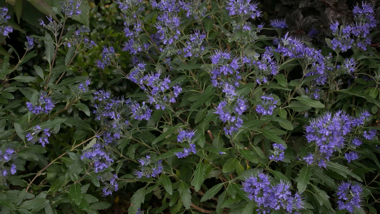 The compact Beyond Midnight Bluebeard grows to only about 2.5 feet high and wide in a nice mounded shape. So, you also can place this stunner in the center of a container where its deep blue blooms complement low-growing white or yellow flowers. Or feature one or more of these shrubs in a garden bed near taller plants. They also work well in borders of garden beds or at the corner of a sidewalk, where they really stand out.