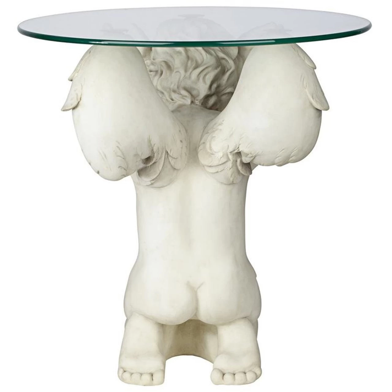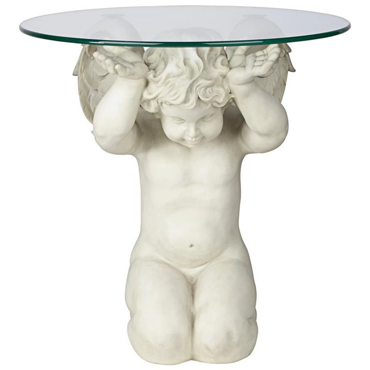 Elevate both your favorite beverage and your mood as they are held aloft by this heavenly table! With the finesse of heaven, an angel serves as the perfect fulcrum for this functional work of furniture art. Our exclusive is sculpted 360-degrees to be admired from all sides before being topped with a â…œ”-thick, 21-inch, pencil-edged glass top. Each curly lock, feathered wing and dimpled knee of this mythical cherub is cast in quality designer resin with a faux stone finish that turns furniture art into a showpiece that can stand up to modern usage. This is a celestial statement piece for home or garden!