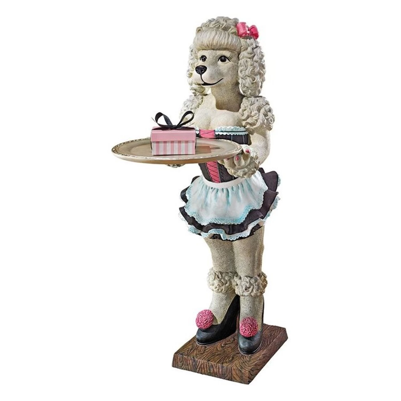 Our favorite French poodle serves up a removable tray with true French flair that’s both tres chic and tres sassy! Standing nearly 3 feet tall from her fluffy Paris hairdo to her pompom slippers, Coco is a tastefully hand-painted quality designer resin charmer who’s as comfortable in your Parisian boudoir as she is holding perfume bottles in a powder room or champagne cocktails next to a favorite chair. We have even envisioned our pampered pooch as a Parisian greeter at your favorite stylist salon. Ooh-la-la, she’s a DT exclusive!