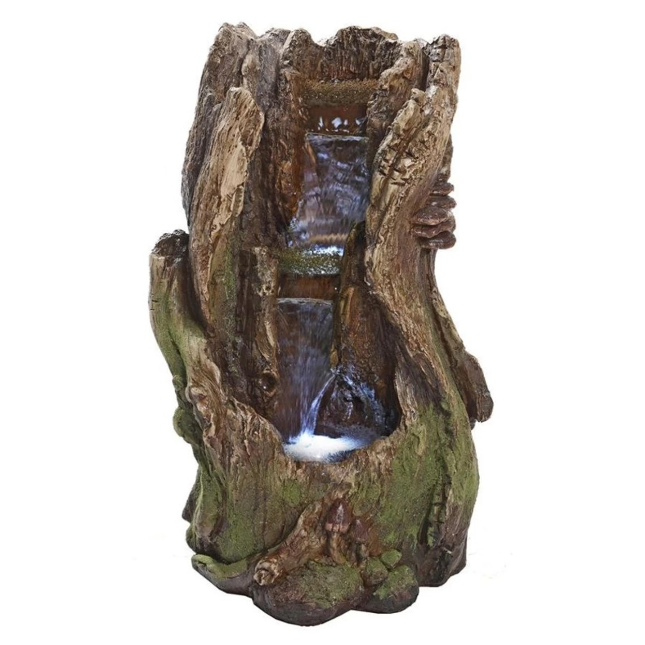 You’ll be hard pressed to find a more naturalistic garden fountain than this amazingly detailed work of functional fountain art! Hidden inside a hollow tree is a unique serpentine waterfall cascading down two tiers into an LED illuminated pool to be admired day or night. The Columbia Falls fountain is perfectly sized to be placed anywhere, from a deck to a patio. Cast in quality designer resin and hand-finished to replicate wood and moss, this investment in garden art features an integrated, UL-listed, indoor/outdoor pump that brings the soothing sound of falling water to your home. Another creative sculptural fountain from the from DT “Small Wonders” collection that will make a delightful gift for yourself or a friend!