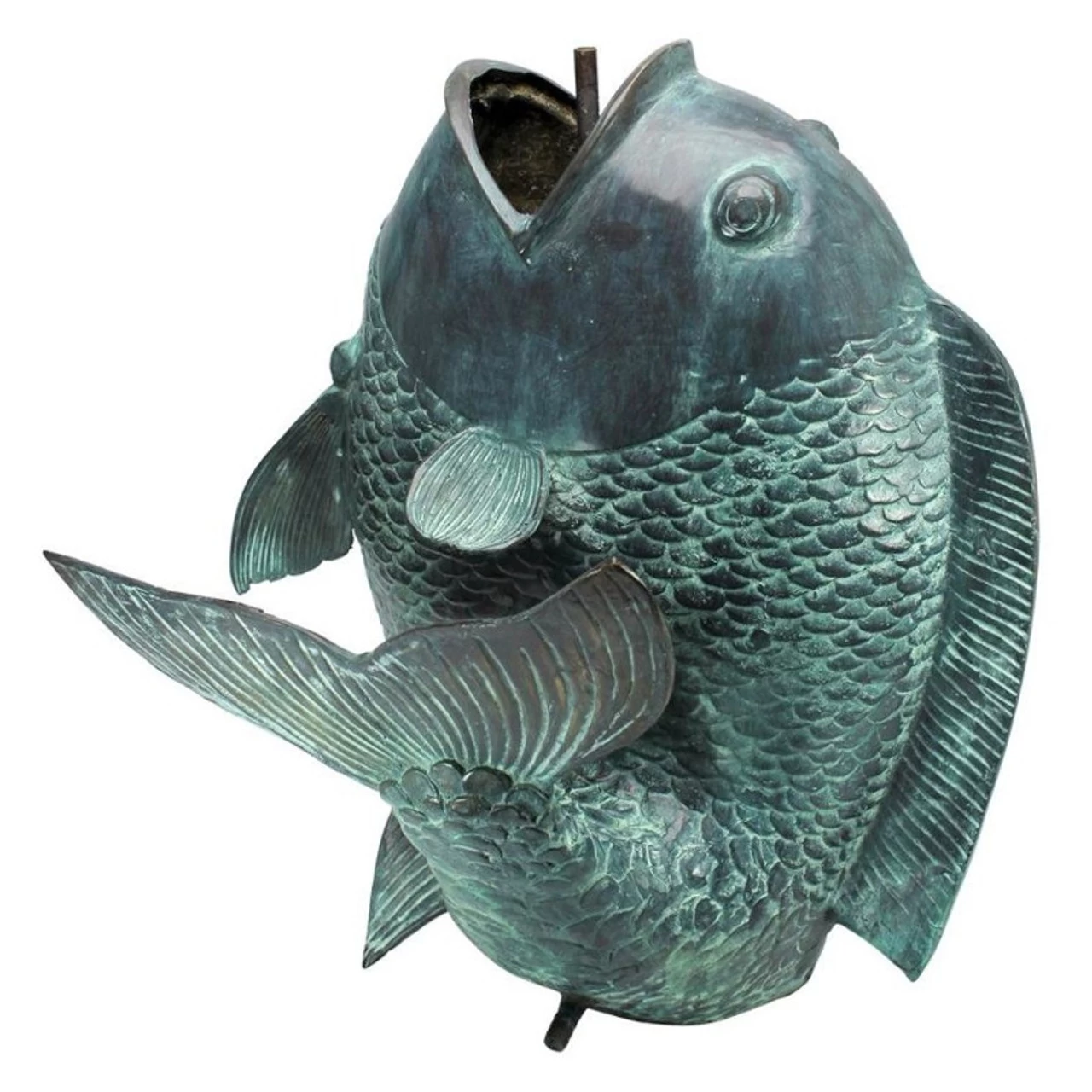 Our “Dancing Fish” bronze statue lends an Asian symbol of grace, beauty, strength, and a touch of whimsy to your garden, fountain or koi pond. Every sculptural detail of our DT-exclusive, bronze spitting fish statue captures a fluidity of motion, from the delicate folds of its flapping fins to the eye-pleasing detail of every scale. Cast in the traditional lost-wax method, featuring our emerald verde patina, this bronze garden statue guarantees lasting beauty. Sure to be a focal point in your garden or pond, our heirloom-quality bronze spitting fish statue conveys that you take the exterior of your home as seriously as the interior. Piped to optionally cascade flowing water from the fish’s mouth into your pond or fountain. Simply add the optional 290 GPH pond pump kit to create beautiful water music in your garden.