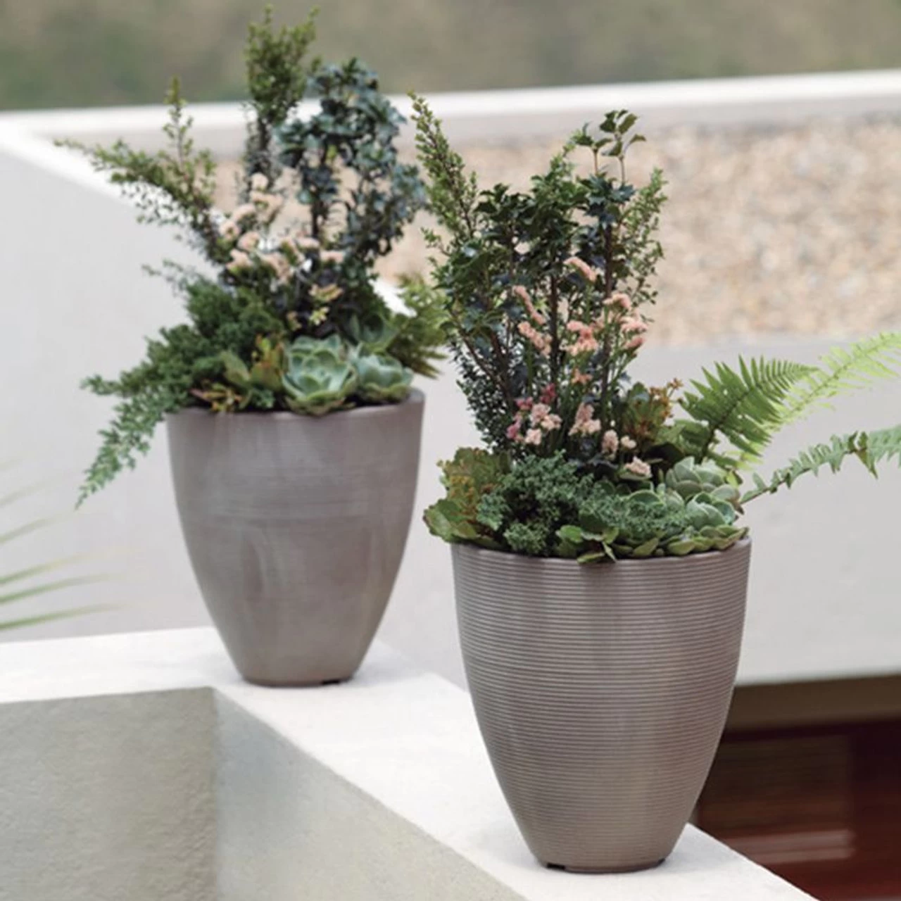 The Delano Tall Planter by Crescent Garden is a mid-sized design, great for succulents, small shrubs, or perennials. These are durable made of lightweight poly resin for indoor or outdoor use. Plus these are double walled for added durability and protection to plant roots. The planters are fade and weather resistant with pre-drilled holes. Pair these with other Delano family planters including the Oval and Bowl designs.