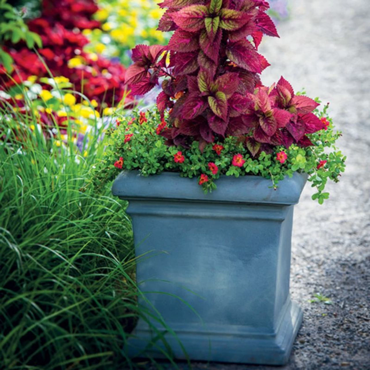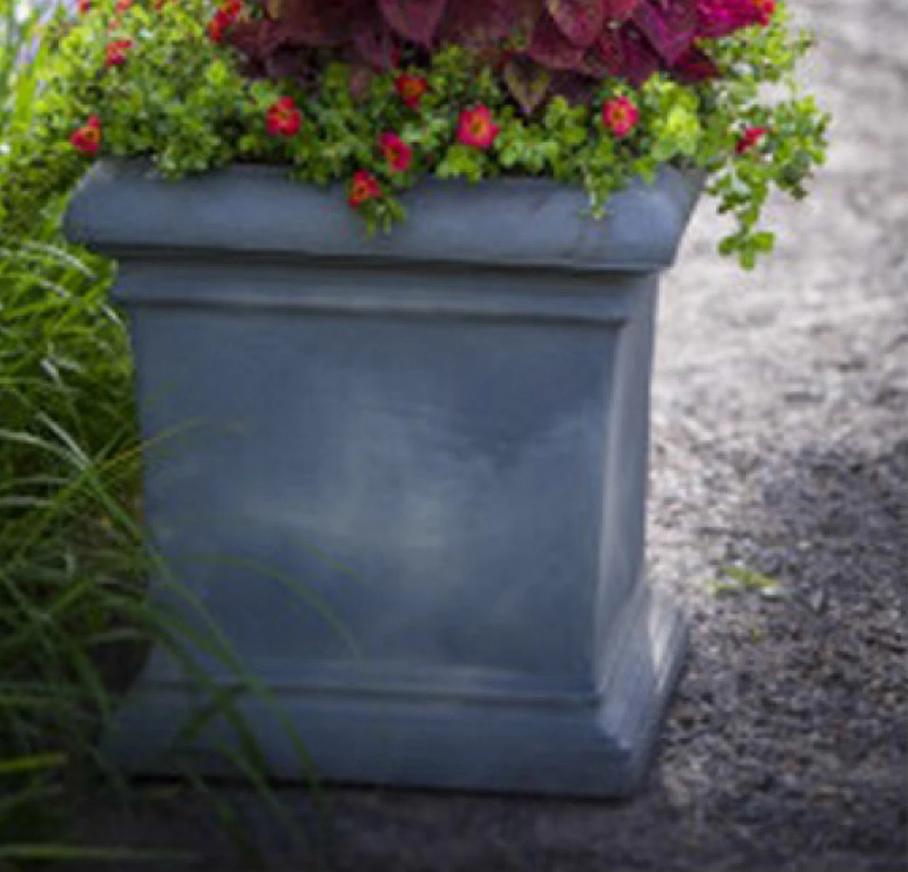 The Dorchester Planter by Crescent Garden has a traditional pillar-style design with a stone style texture. These are made out of a weather resistant poly resin that is durable for indoor and outdoor use. It is also fade resistant and crack proof. The planter has pre-drilled holes for drainage. These work great with traditional perennial or annual plants you would typically use in a planter. Mix heights and color contrasts when planting.