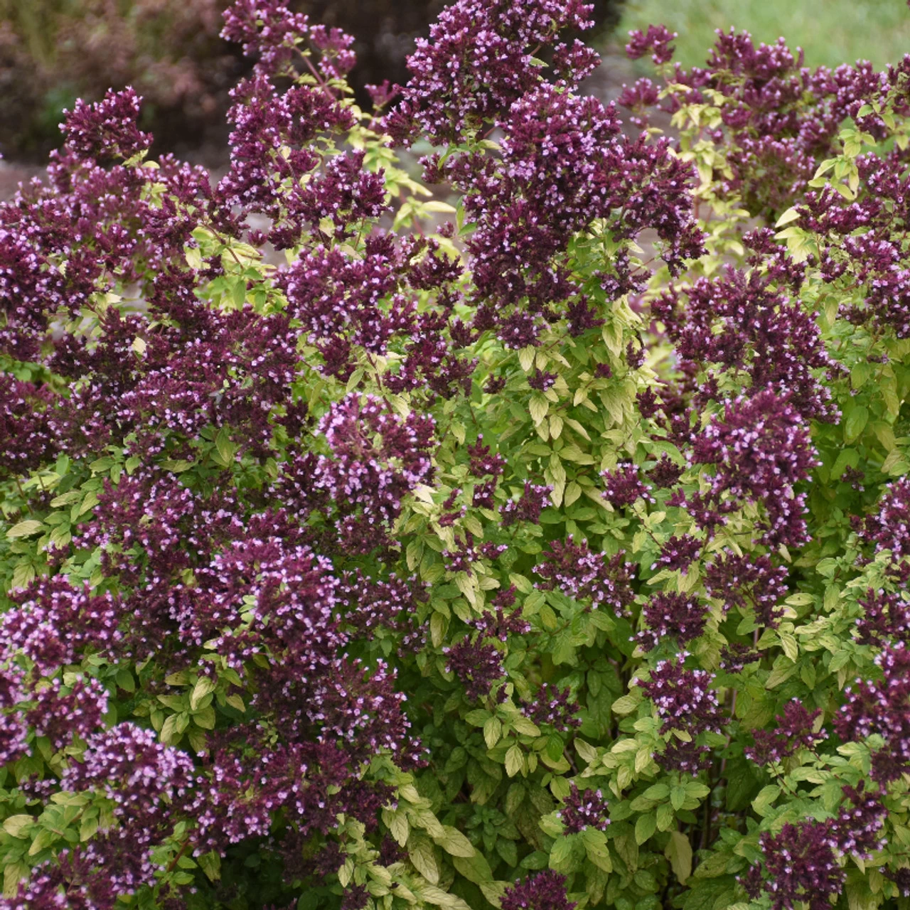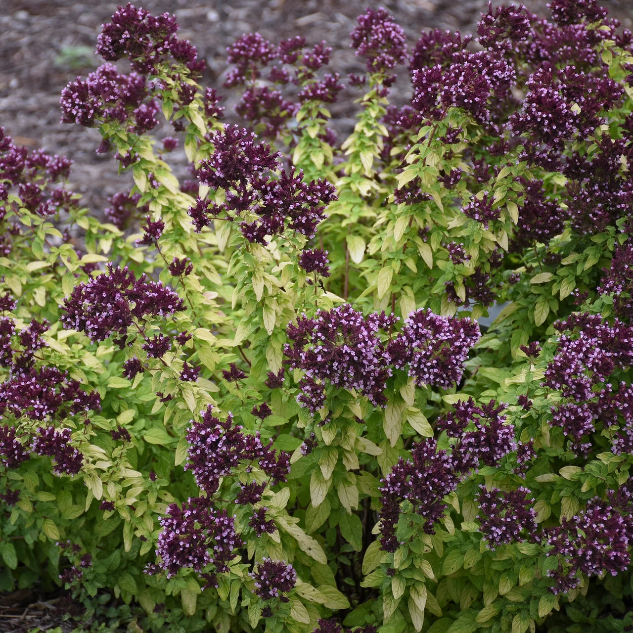 Great as a showy flower garden plant or as an attractive addition to your herb garden, you will get dual purpose use from this versatile perennial herb. Sporting striking chartreuse leaves in spring and throwing purple calyx from which emerge mauvy pink flowers in late summer, this showy little perennial will find a place in your heart and your garden. A member of the mint family, this perennial will show a tendency to spread easily throughout your garden. After the flowers fade in late summer, the purple calyx remains giving the plant an unique color combination until fall. As an edible herb, this variety of oregano is less potent than other oregano varieties.