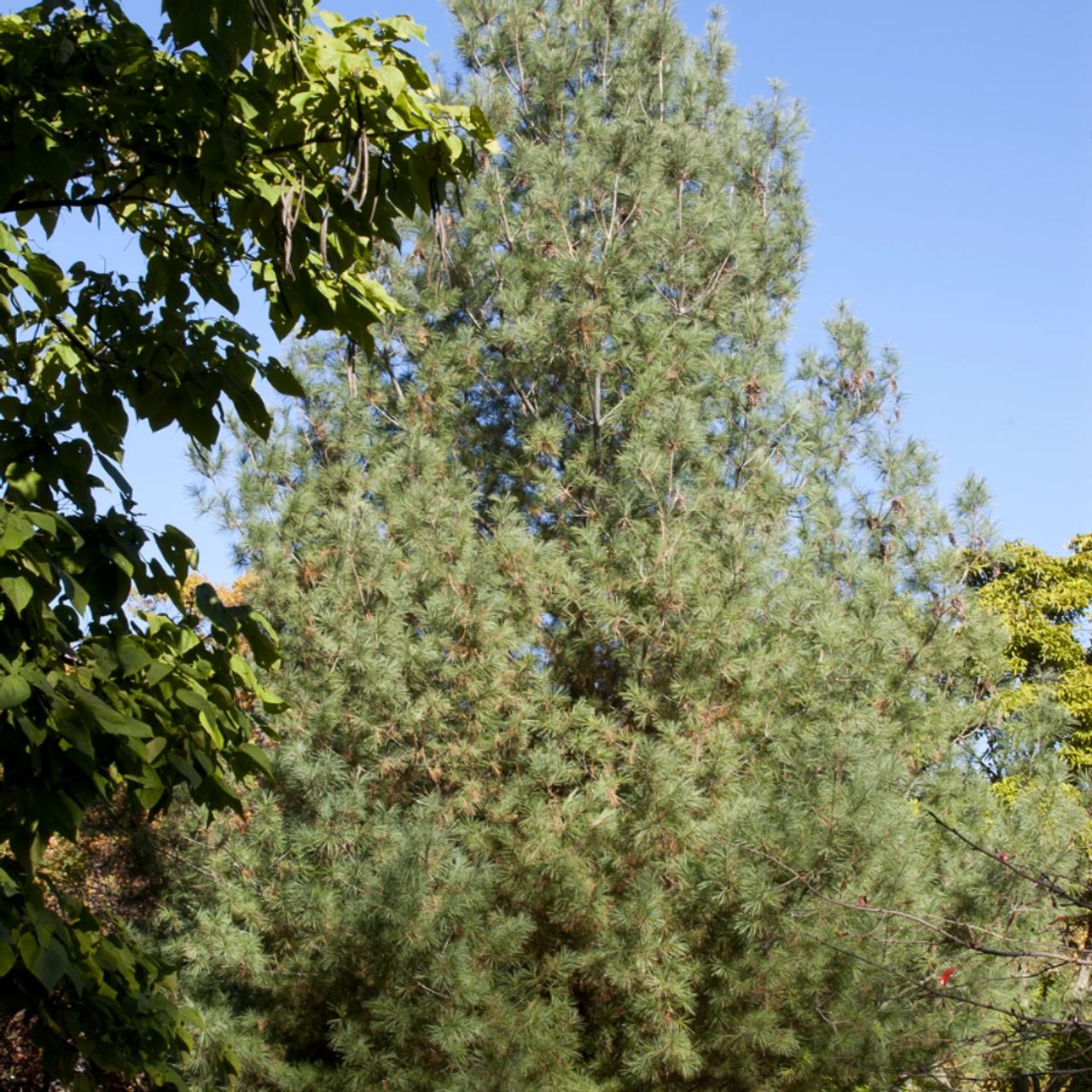 The Eastern White Pine or Pinus strobus is a majestic evergreen. The conifer has long, soft blue-green needles that grow in bundles of five. After the tree is a few years old, it will produce cylindrical cones that can reach 6 inches long. Cone production will peak every 3 to 5 years. This is a low-maintenance tree that can grow very large.