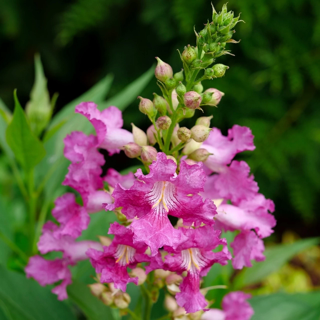 The dark purple, tubular flowers of the El Niño Desert Orchid open to reveal white stippling and prominent stamens. Flowers initially bloom in late spring or early summer and continue sporadically throughout the growing season. The El Niño Desert Orchid is not an orchid but a hybrid of other plants native to North America. Also known as Chitalpa, this plant features broad leaves that come to a narrow point. New foliage has a bronzy hue before settling into a medium green.