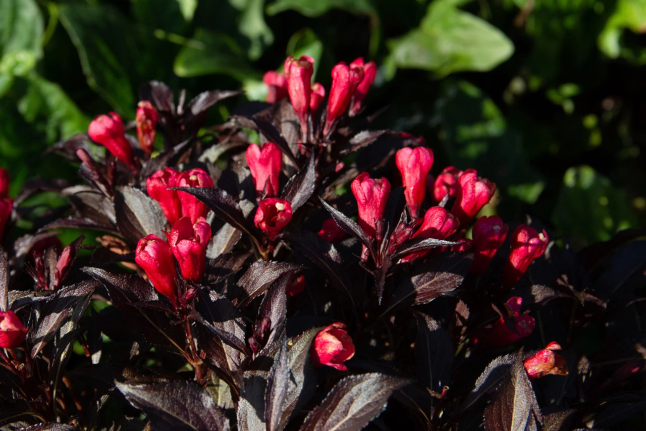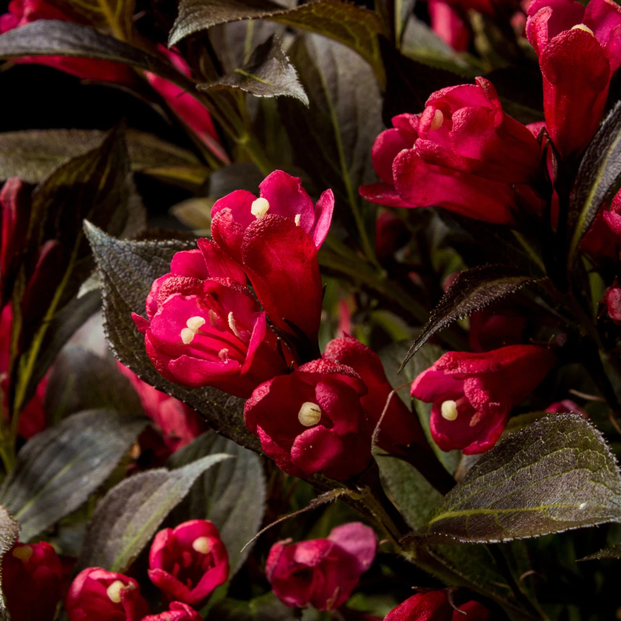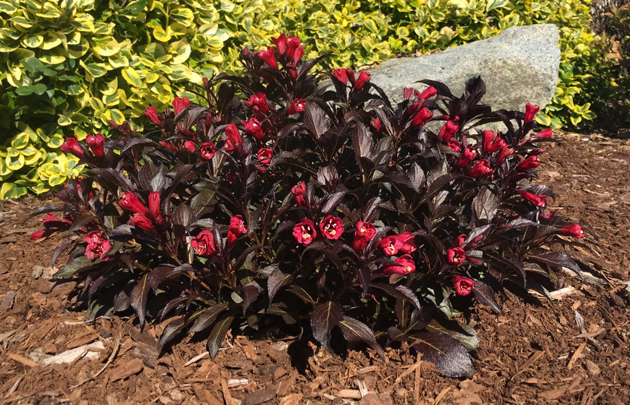That’s right. You will love the spark that Electric Love Weigela adds to your landscape. Known for their easy care, pollinator attraction, and numerous colors, weigelas are popular shrubs for all kinds of landscapes. Electric Love is a compact weigela, growing to only about 2 feet high and 3 feet wide. Another difference with this weigela and most shrubs is its purely unique color of vibrant red blooms against deep green, nearly bronze leaves.