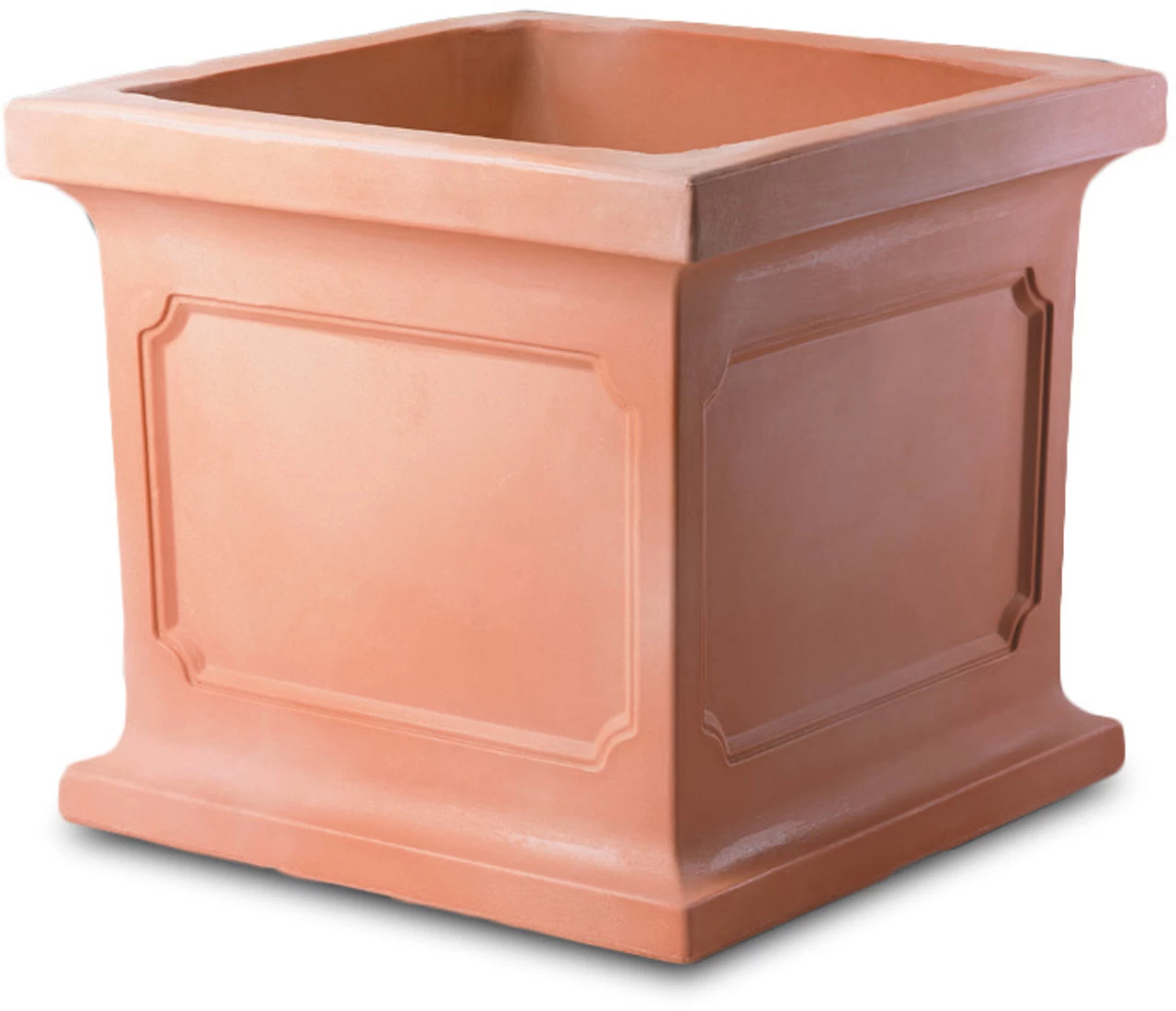 The Estate Square Planter by Crescent Garden has a wonderful traditional design with optional hidden casters. The classic design of these planters will last for years because of the durable poly resin that is both durable and lightweight. These can be used both indoors and outdoors. These planters go great with boxwoods, holly bushes, and other classic shrubs.