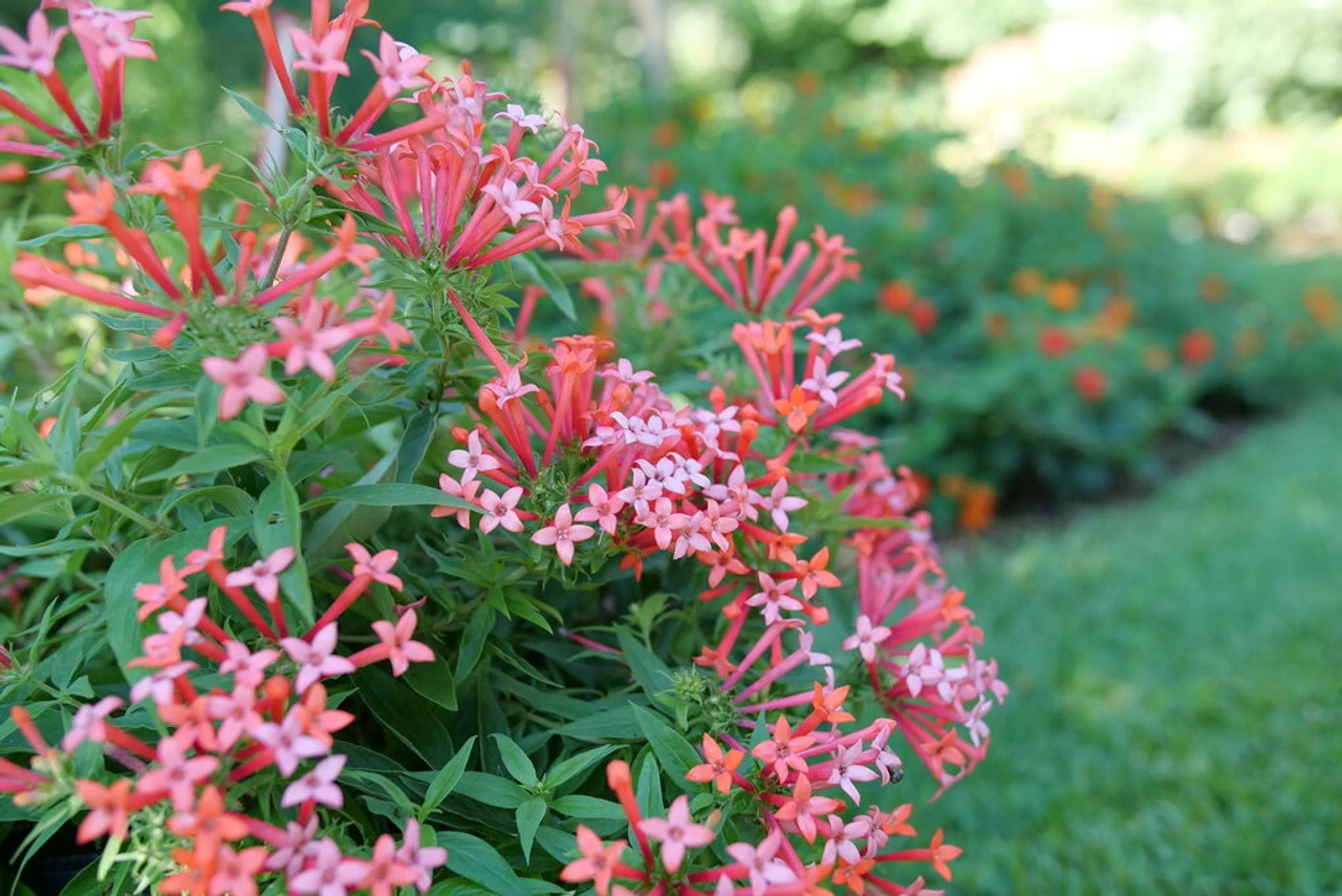 The bright blooms of the Estrellita Little Star Firecracker Bush or Russelia equisetiformis add a pop of vibrant color to an outdoor space. Flowers grow in clusters on top of tall stems, and the long trumpet-shaped blooms look like fireworks. The flowers are complemented by narrow, sword-shaped foliage. This beauty blooms all summer long for an intense burst of consistent color.