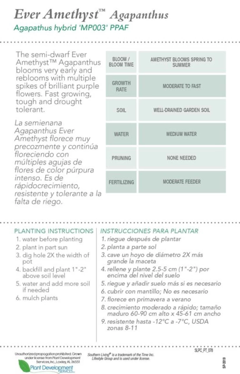 The Ever Amethyst Agapanthus should be planted in full sun to part shade. It has low water needs. The soil should have good drainage and a yearly application of composting. To prevent crowding, divide clusters every three to four years.