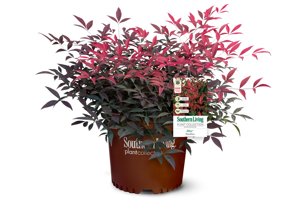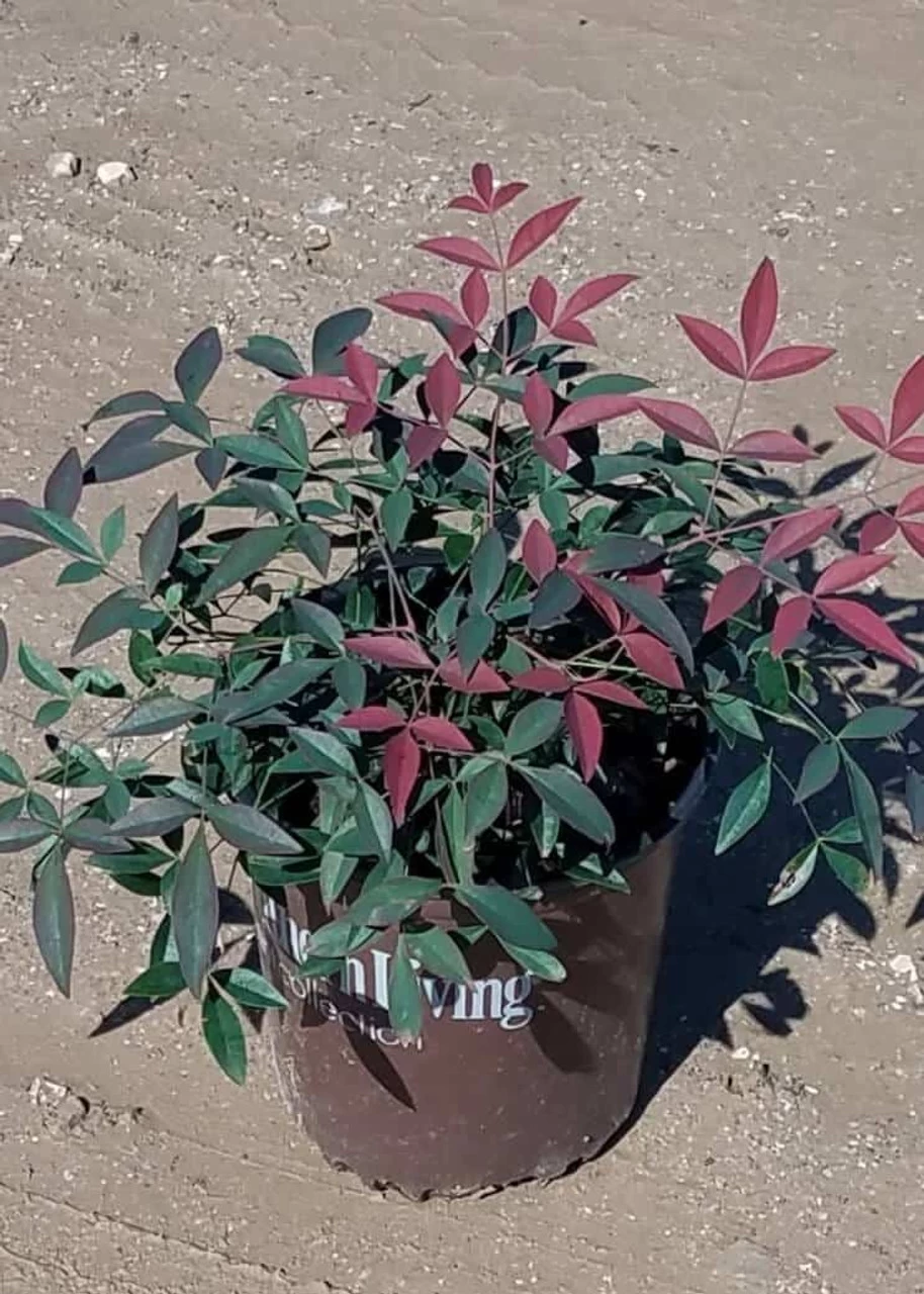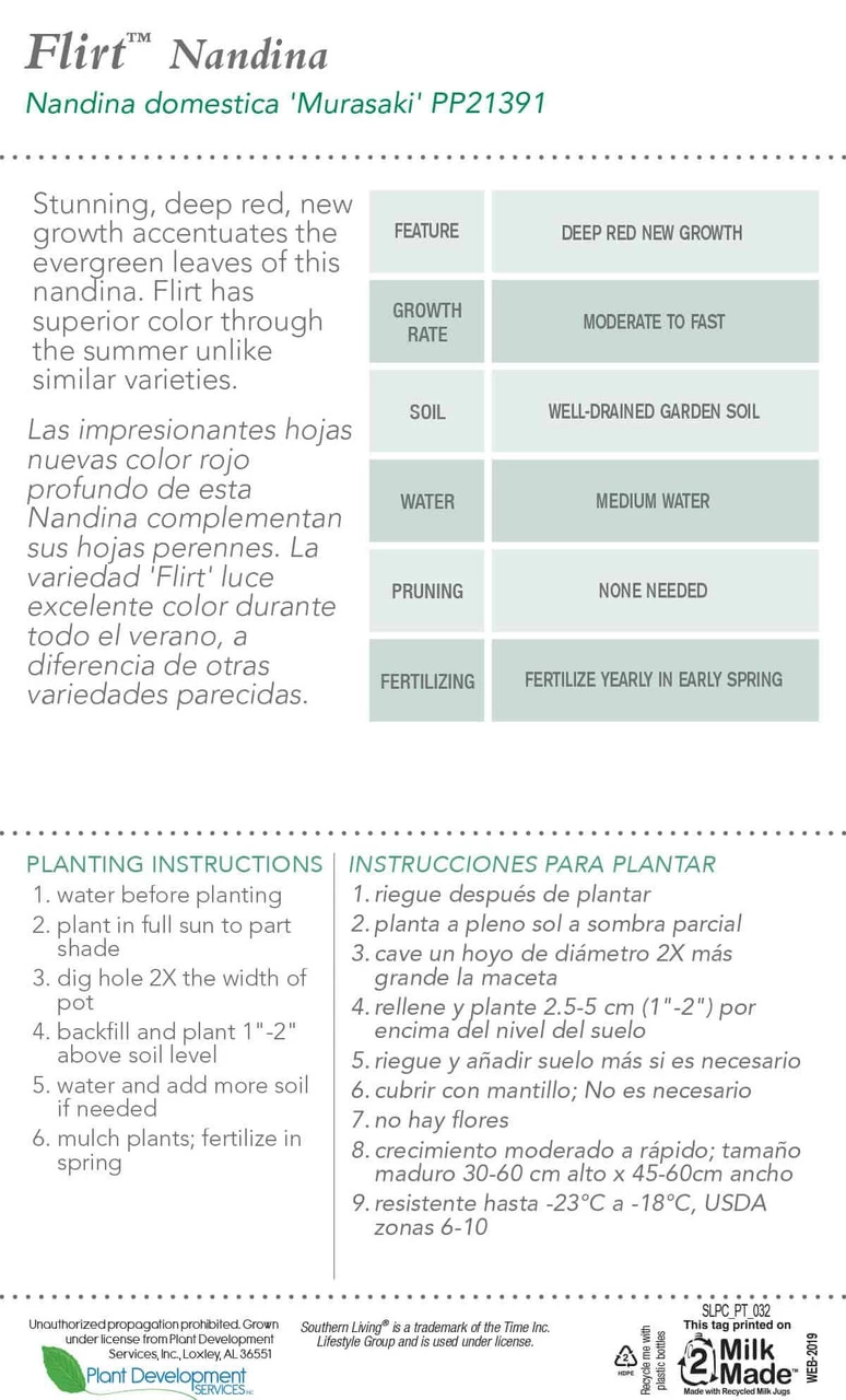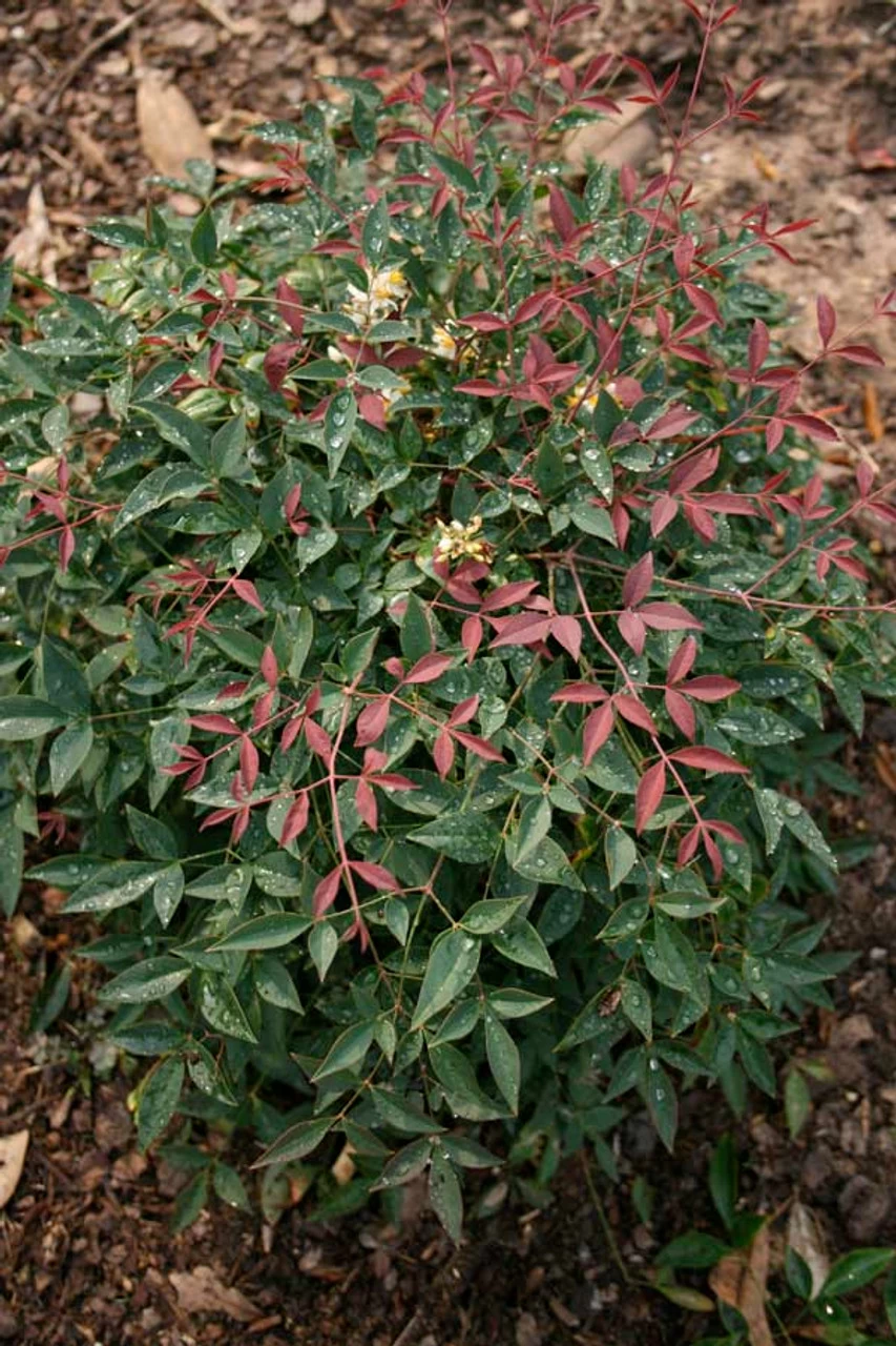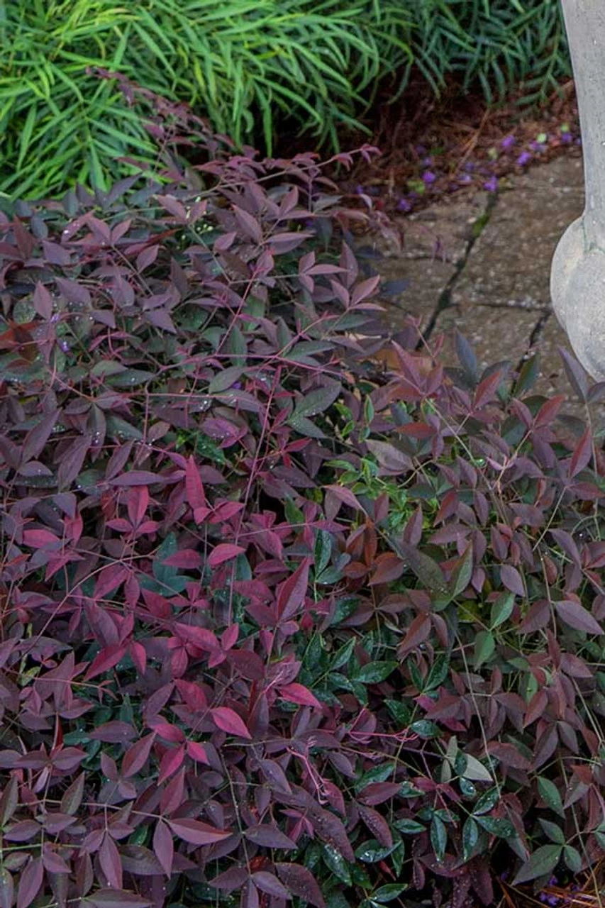 Flirt Nandina, Nandina domestica ‘Murasaki’, is an evergreen shrub with deep red foliage from spring until fall. Mature leaves are a bluish-green. Ideal in the border, as an informal, low hedge, in rock gardens and as a groundcover. Perfect for slopes. Also called Heavenly bamboo.