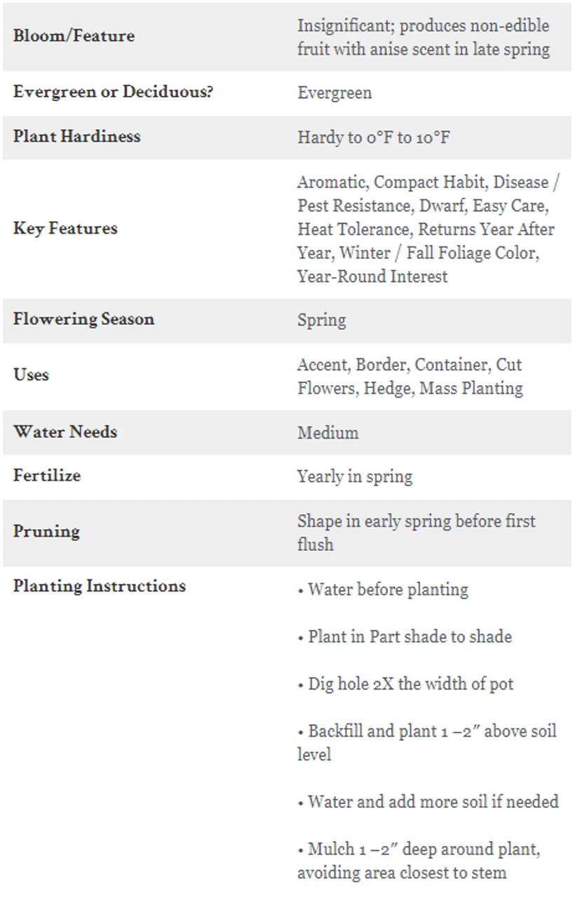 | Foliage Type: Evergreen |