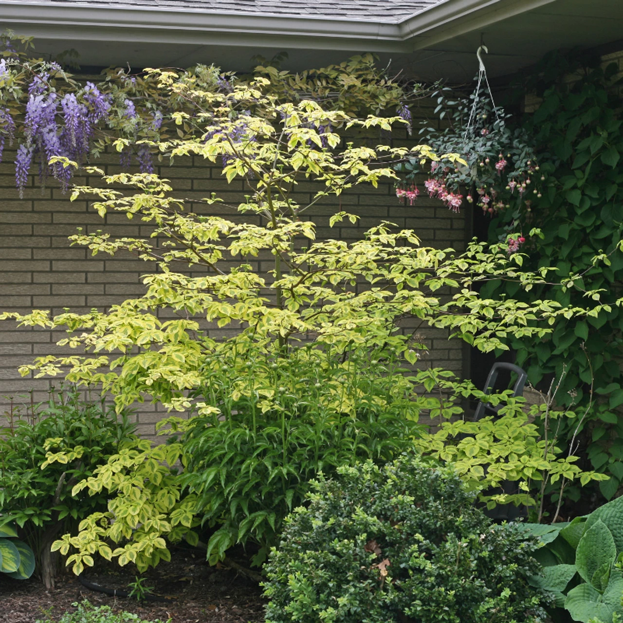 Gardeners hear about layering in the landscape all the time and Golden Shadows pagoda dogwood gets the job done. Dogwoods generally have strong horizontal branching and this one fills that role and more. It has gold and green variegated leaves to add to its beauty. Even in winter, the tree’s horizontal branching adds beauty to the landscape. Golden Shadows gets 10 to 12 feet tall and wide.