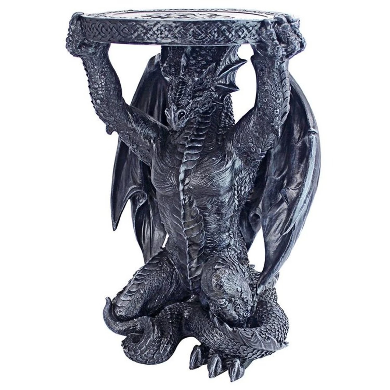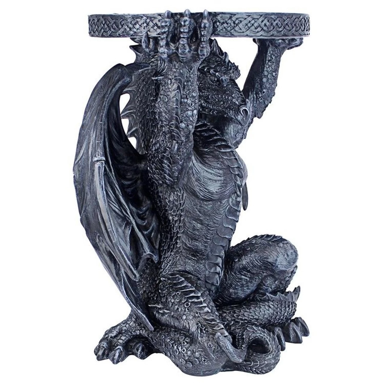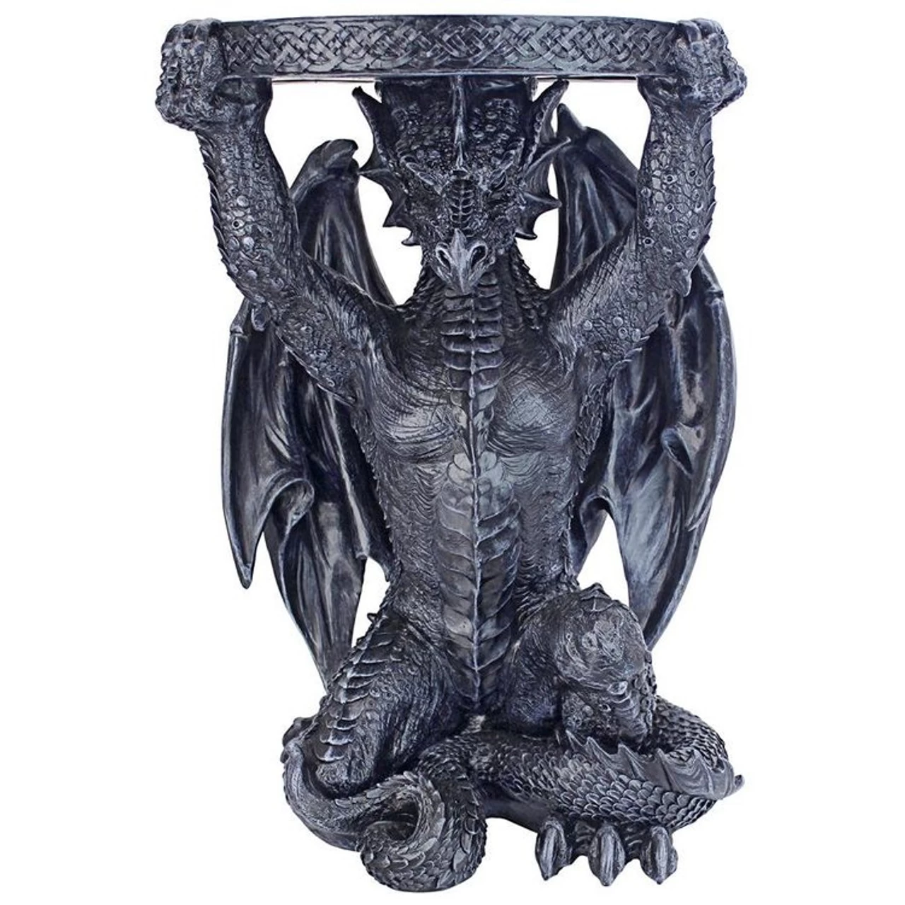 Presenting its war shield as a tabletop and a sign of peace, the Gothic Dragon of Netherley Boggs submits to your command by keeping your Medieval tankards, modern gaming controllers or other collectibles close at hand. Cast in quality designer resin to capture details from the mystical Celtic knot designs on top and sides to the fierce musculature of this monster beast, our dramatic DT original dragon side table boasts a dark faux gray stone finish. Our almost 2-foot tall sculptural work is just the stalwart you want guarding your home or garden!