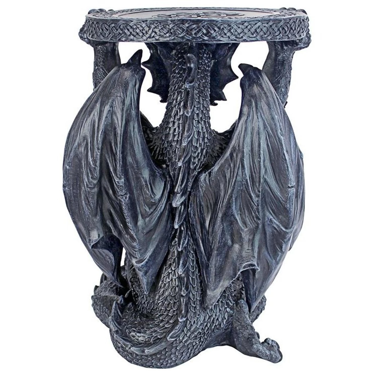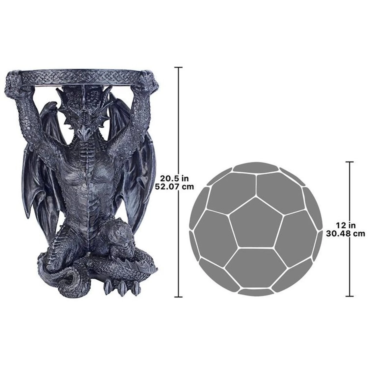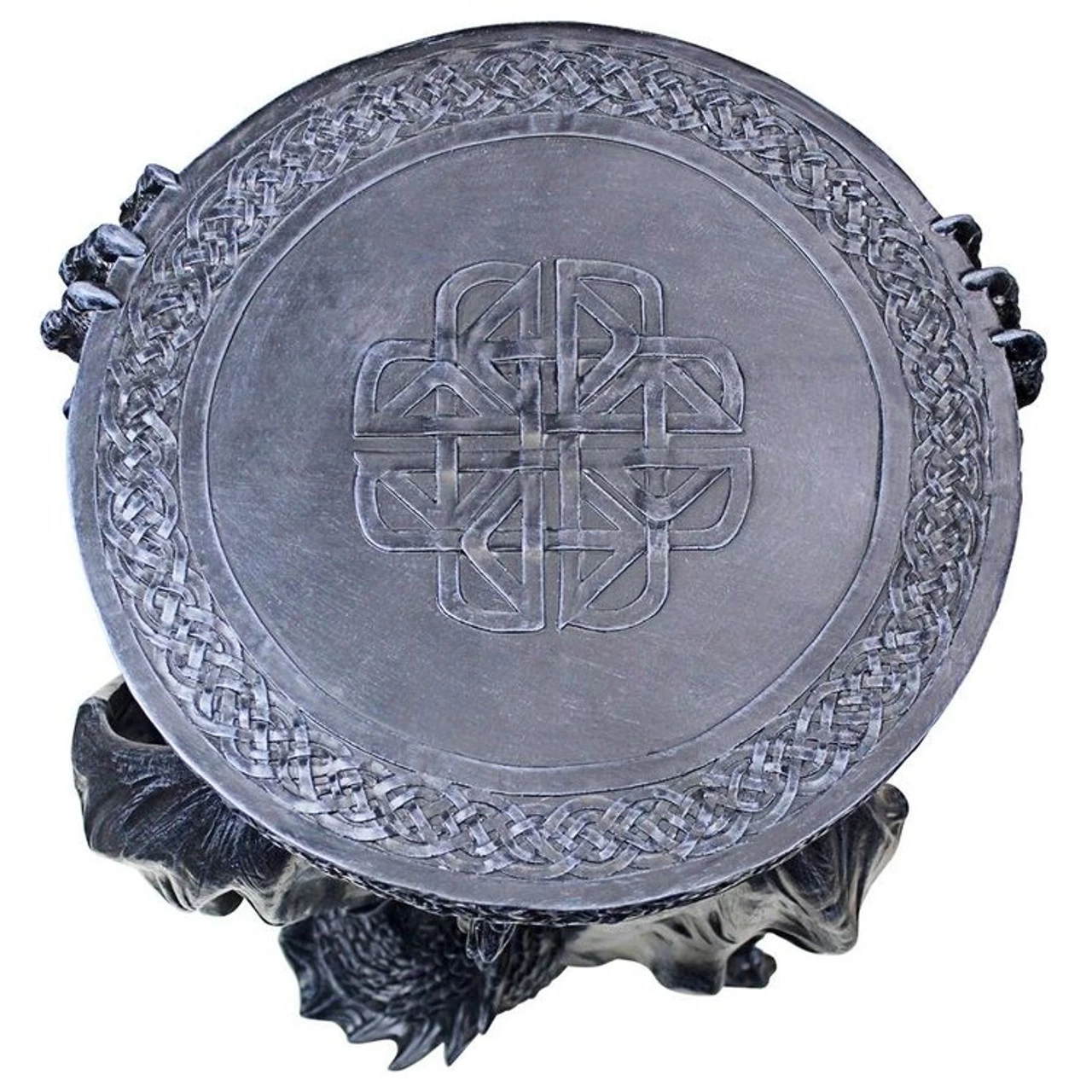 Presenting its war shield as a tabletop and a sign of peace, the Gothic Dragon of Netherley Boggs submits to your command by keeping your Medieval tankards, modern gaming controllers or other collectibles close at hand. Cast in quality designer resin to capture details from the mystical Celtic knot designs on top and sides to the fierce musculature of this monster beast, our dramatic DT original dragon side table boasts a dark faux gray stone finish. Our almost 2-foot tall sculptural work is just the stalwart you want guarding your home or garden!