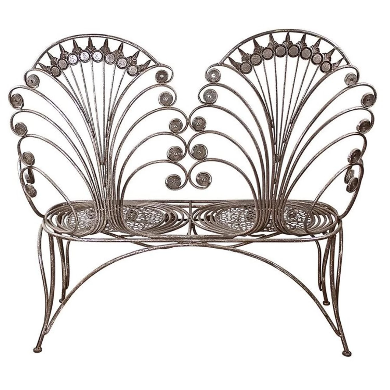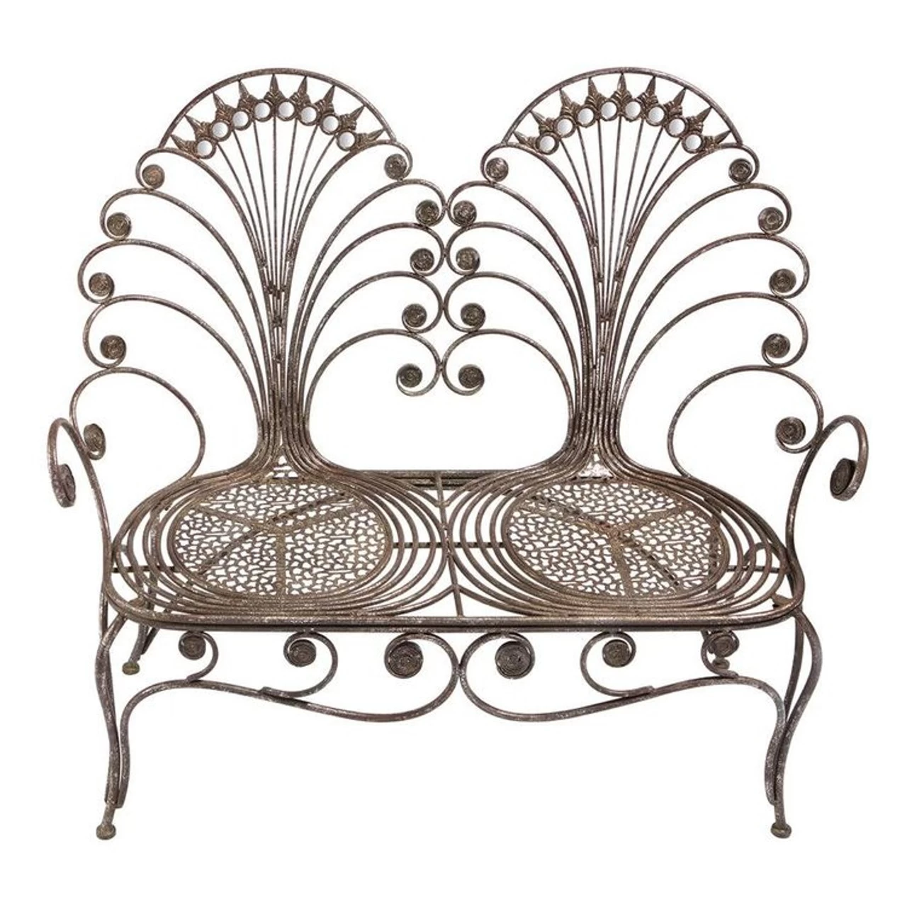 A symphony of vintage French style, this magnificently sculptural bench helps celebrate your garden in a grand way! Two can lounge in our DT exclusive, deeply contoured loveseat that features an exaggerated, hand bent, intricately Victorian twisted metal fan back, wide seat, scrolled skirt and gracefully fluted feet. Picture it on your porch, deck or patio as the perfect spot for enjoying beautiful sunsets or summer evenings full of shooting stars. Its uniquely weathered finish boasts a faux bronze finishing technique for a highly weather-resistant coating that prevents oxidation, ensuring years of outdoor use. A beautiful statement piece!