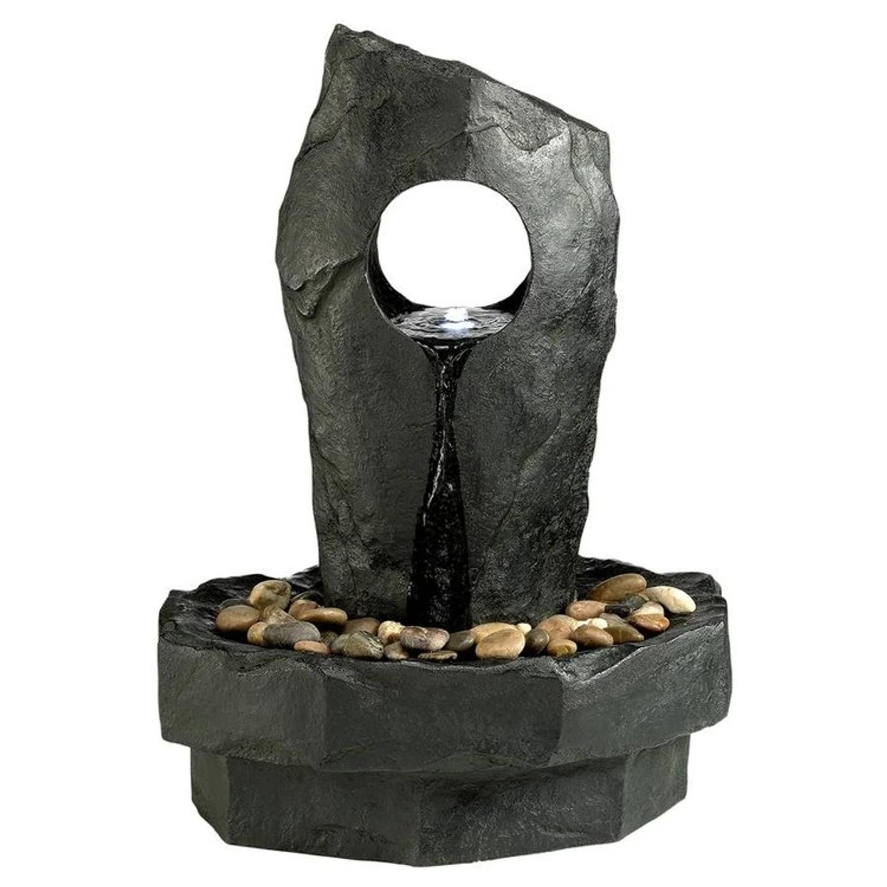 Reminiscent of master Bauhaus artist Walter Gropius’ idea of infinity simplified, this modern fountain interpretation is sure to be an impressive statement in your garden or on your patio. Cascading water flows to create an in-home oasis and peaceful, meditative atmosphere as they trickle over the included river rocks in the base. Gropius believed that all art should work together and he would appreciate the clean lines and simple rough-faced black faux slate displayed in this unique flowing garden fountain form. In the hollow, water bubbles up, highlighted by an included LED light kit, so you can even enjoy this garden fountain in the evening. It can be placed indoors or out and constantly recycles water from a hidden reservoir. Cast in quality designer resin and hand-finished to replicate fine natural stone, our gateway to forever garden fountain also features a UL-listed indoor/outdoor pump. Another quality garden fountain from DT!Simple assembly required.