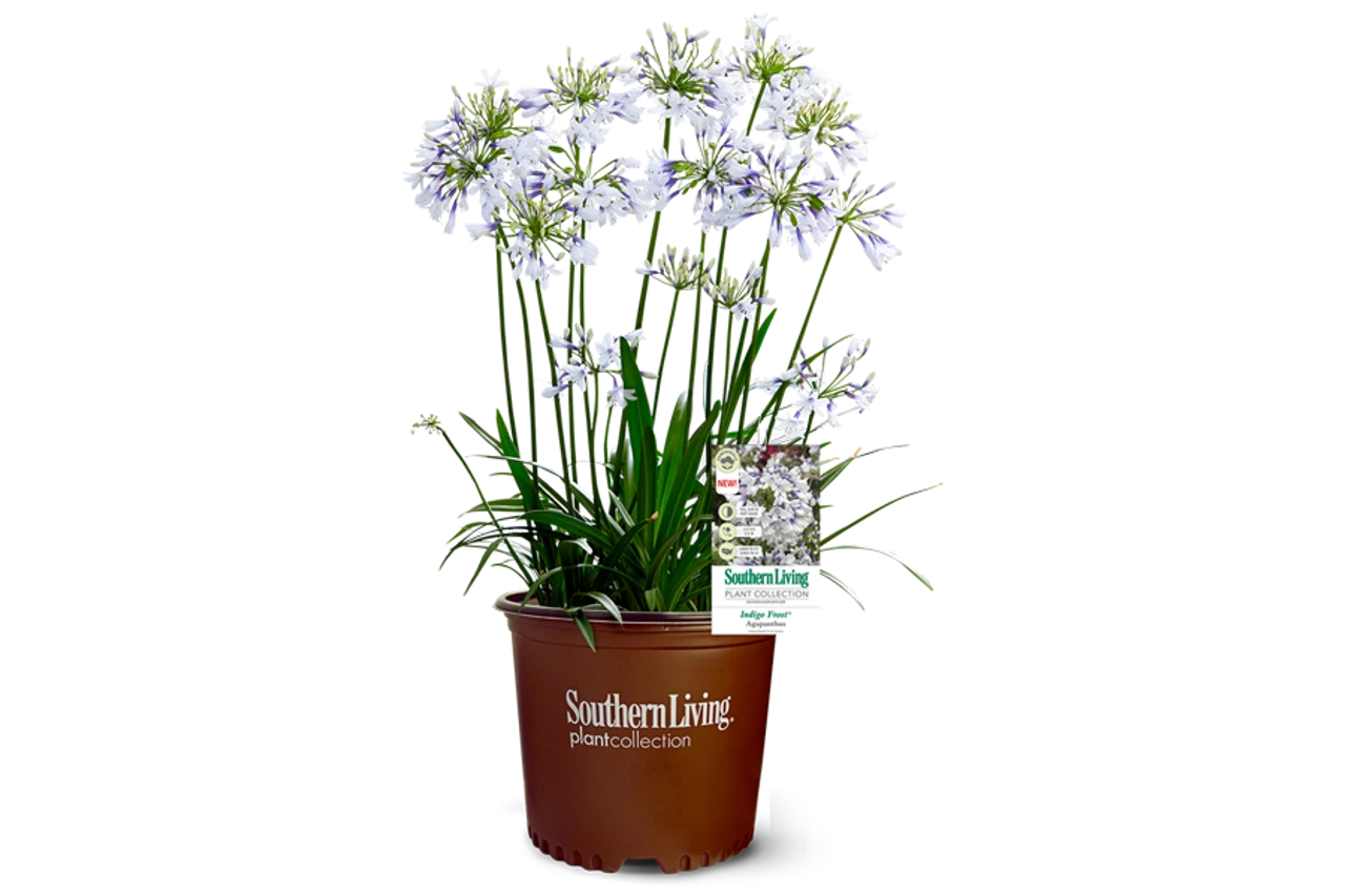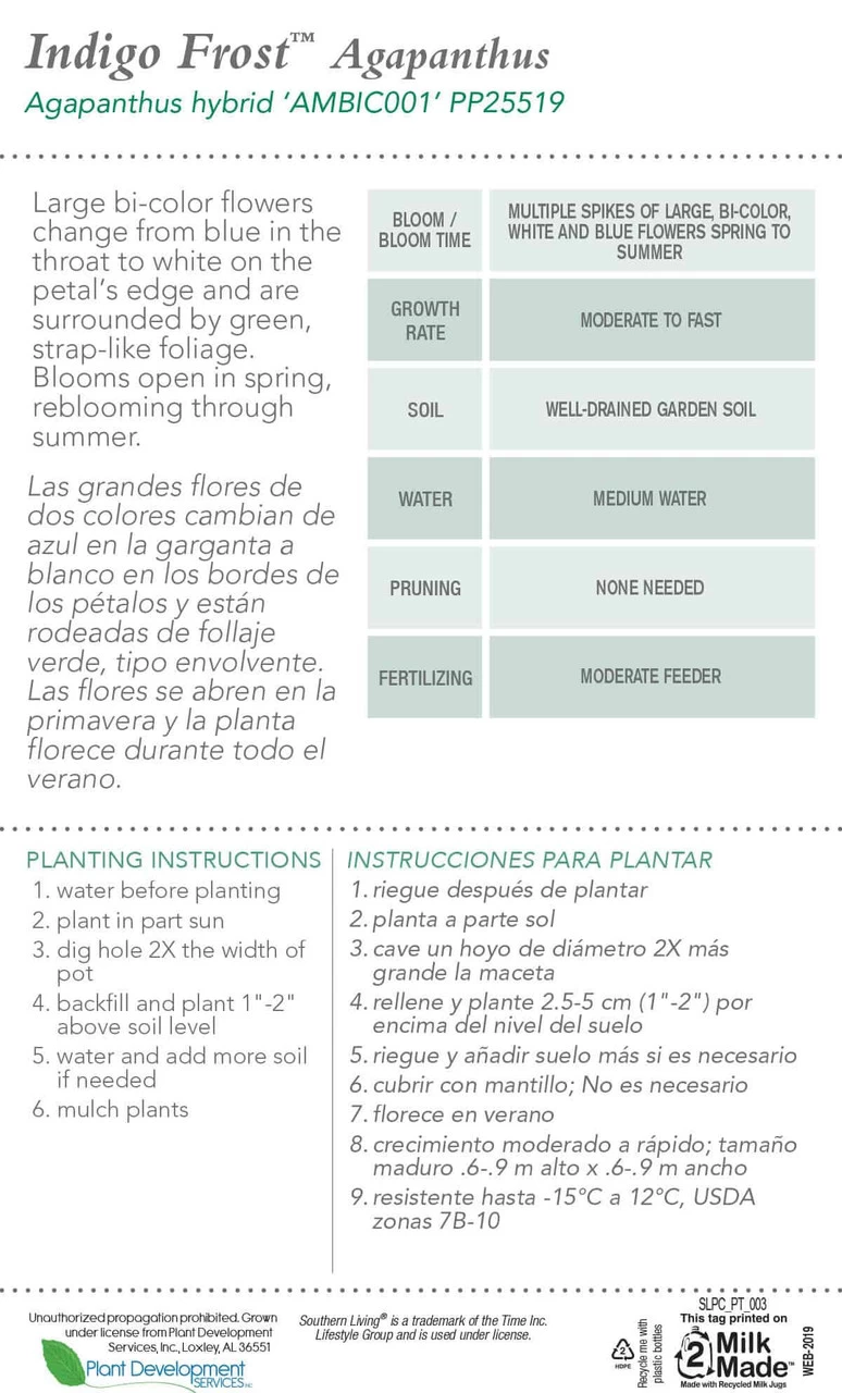 The Indigo Frost Agapanthus grows to be sixteen to eighteen inches. Spacing should be one to three feet, center on center. Proper spacing should be followed to ensure your plants roots develop and the plant remains healthy.
