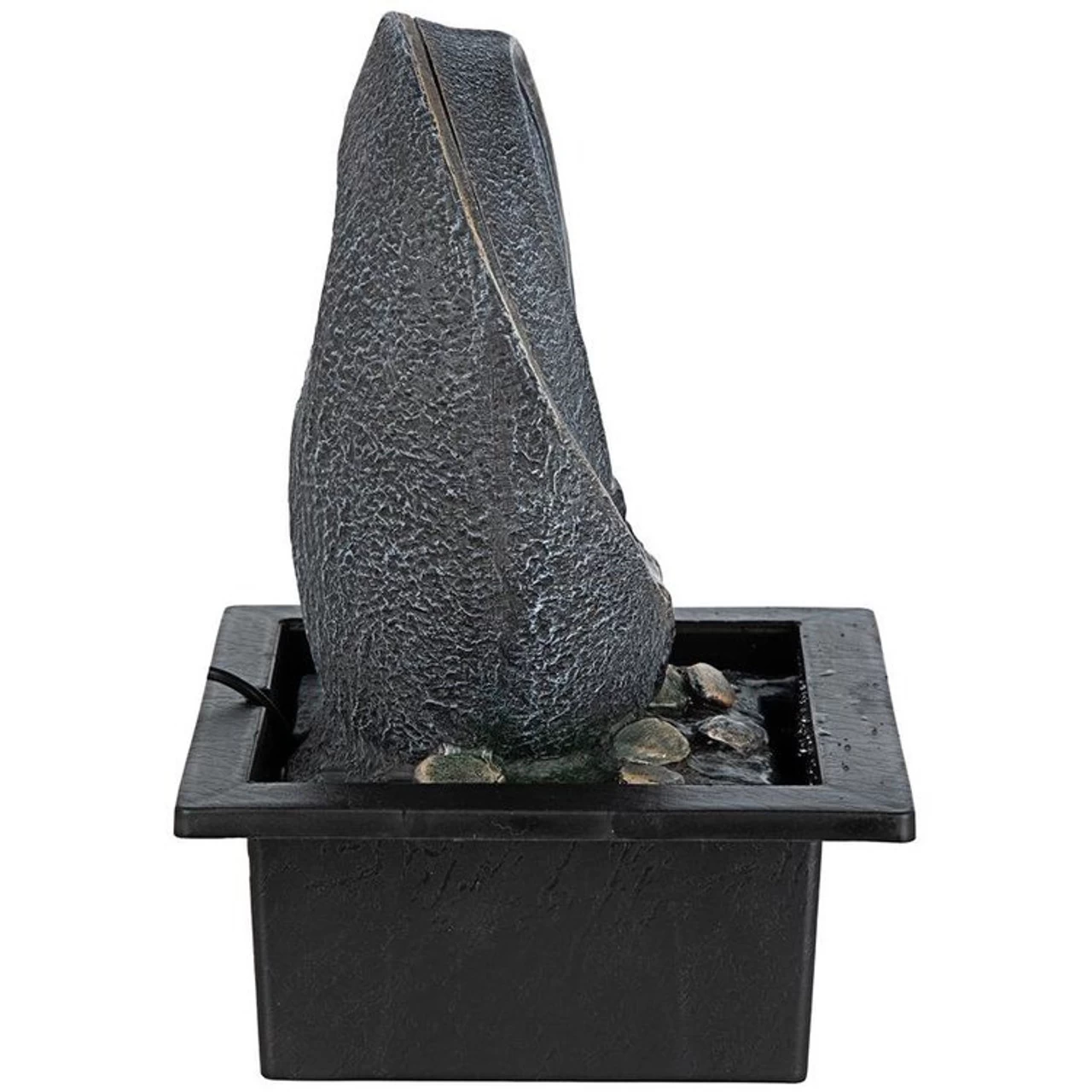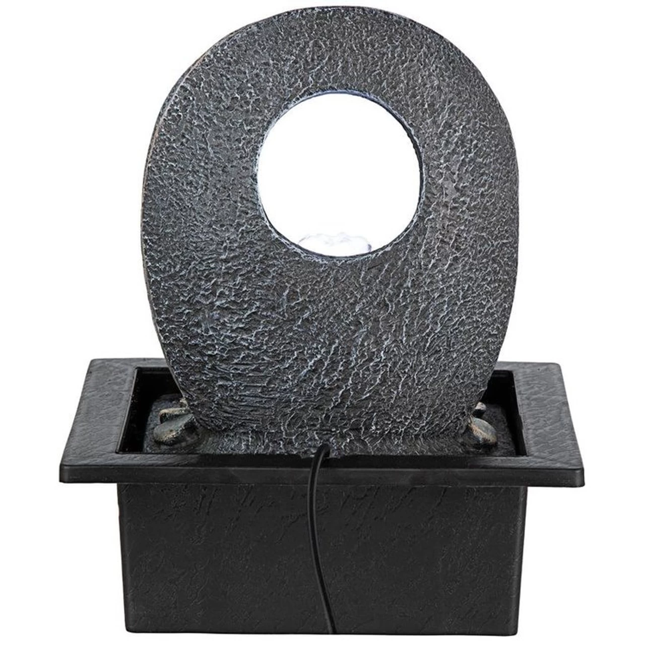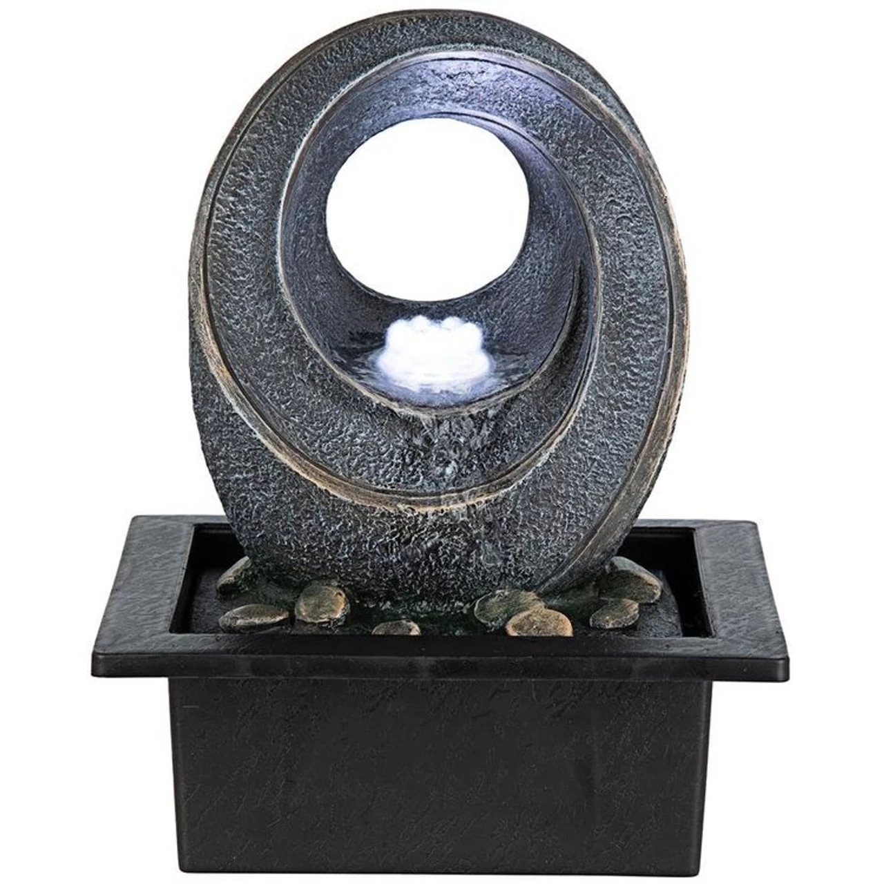 Searching for a peaceful, relaxed, serene oasis amid a chaotic world? This petite DT tabletop fountain is a zen water feature that employs organic elements in a modern style. The eye naturally follows as sparkling water quietly moves through the spiral circle design down toward the rocks where it peacefully bubbles. Cast in quality designer resin and hand-finished to replicate natural stone, this lightweight, portable, and easy-to-set-up fountain also features a UL-listed indoor/outdoor pump and hidden, underwater LED lights that emit a soft glow. It’s ready the moment you add water and plug it in!
