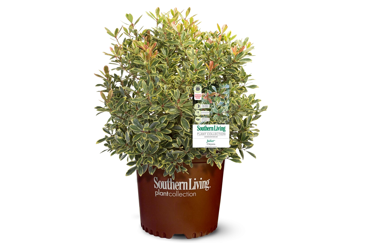 The dense foliage is unique for a Cleyera. It emerges as a maroon color and transitions to an olive green with cream-white edges. The Juliet Cleyera is an evergreen that provides your yard with color all year. With a mature height of eight to ten feet and a width five to six feet wide, this shrub makes for a perfect screen or hedge. Other uses include accent and mass planting.