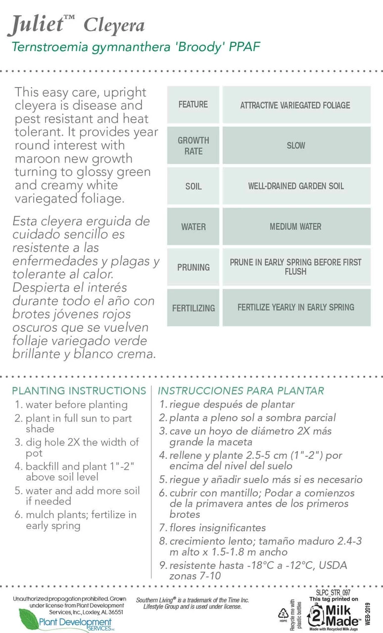 Plant the Juliet Cleyera in full sun to part shade for best results. Water regularly until established. Once established, water needs are regularly. Soil should remain moist and well-drained. Soil Ph level should be acidic. Apply fertilizer in the spring that is specifically for acidic plants. Trim in the spring before new growth appears to shape.