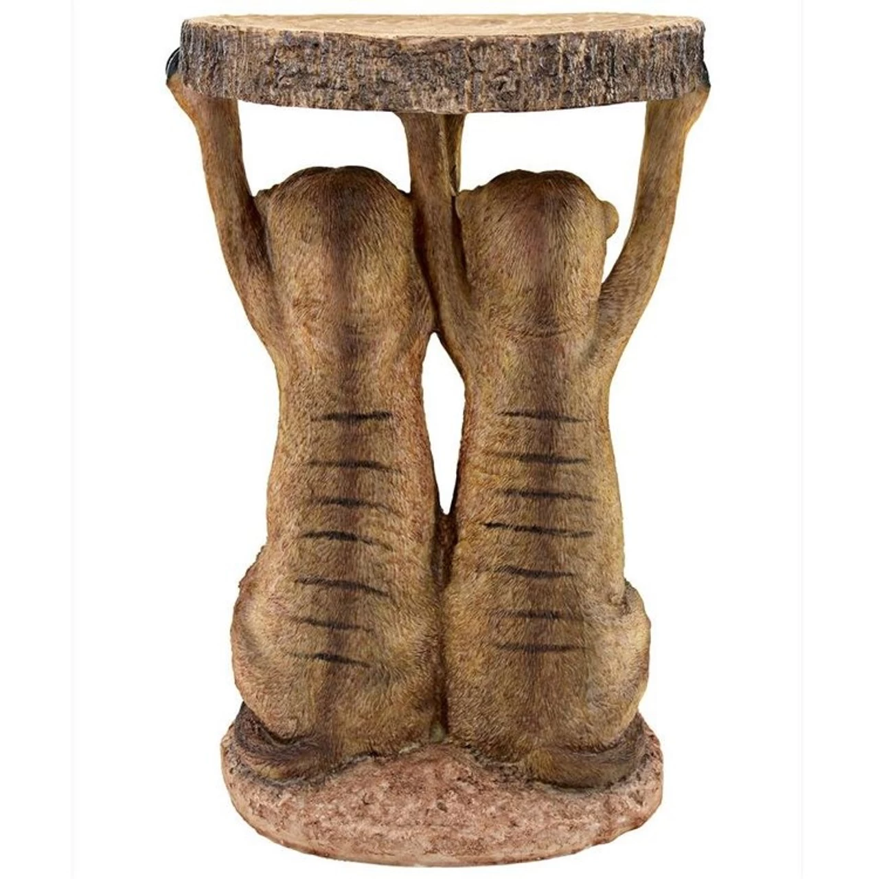 Because they’re normally desert dwellers, our thirsty little meerkats are doubly anxious to hold your beverages or to just rest in the shade of this outdoor accent table! Cleverly sculpted 360 degrees to be admired from any angle, our mighty mammals feature characteristic sentry stance, glistening eyes and wide smiles to add their personable decor magic to your home or garden. Our almost two-foot tall sculptural meerkat side table is cast in quality designer resin and painted in authentic desert tones as a DT exclusive.