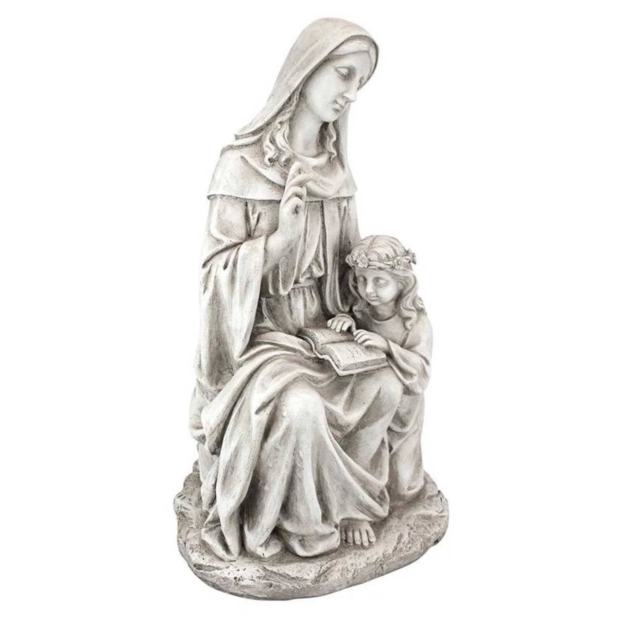 In this endearing statue, St. Anne tutors the most blessed of all women at her knee, the young virgin girl who would grow to become the mother of the Lord Jesus. With sweet tenderness in faithfully teaching bible scripture to a young Mary, St. Anne exemplifies how God grows miracles from even the most seemingly simple daily work put before us. As the patron saint of unmarried women, housewives, women in labor and grandmothers, St. Anne in this Holy Family garden statue will lend her grace to any spot of quiet meditation. Our DT exclusive sacred garden statue is captured in quality designer resin with an antique stone finish.