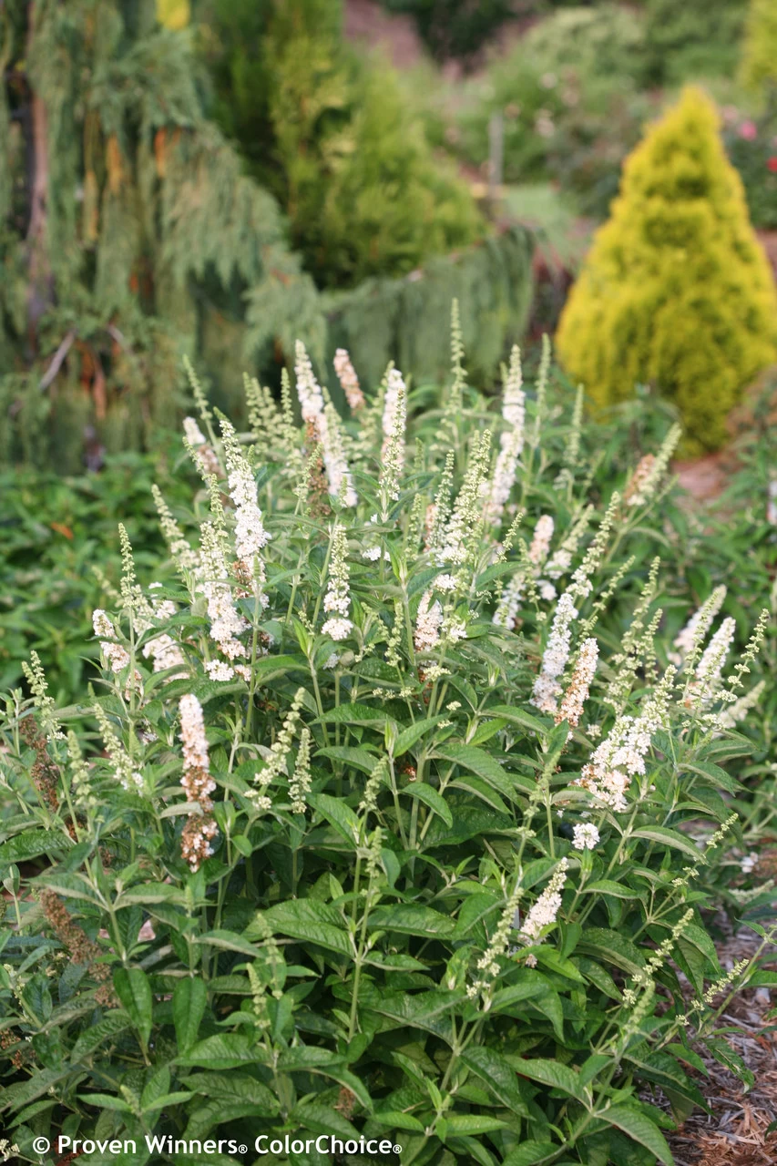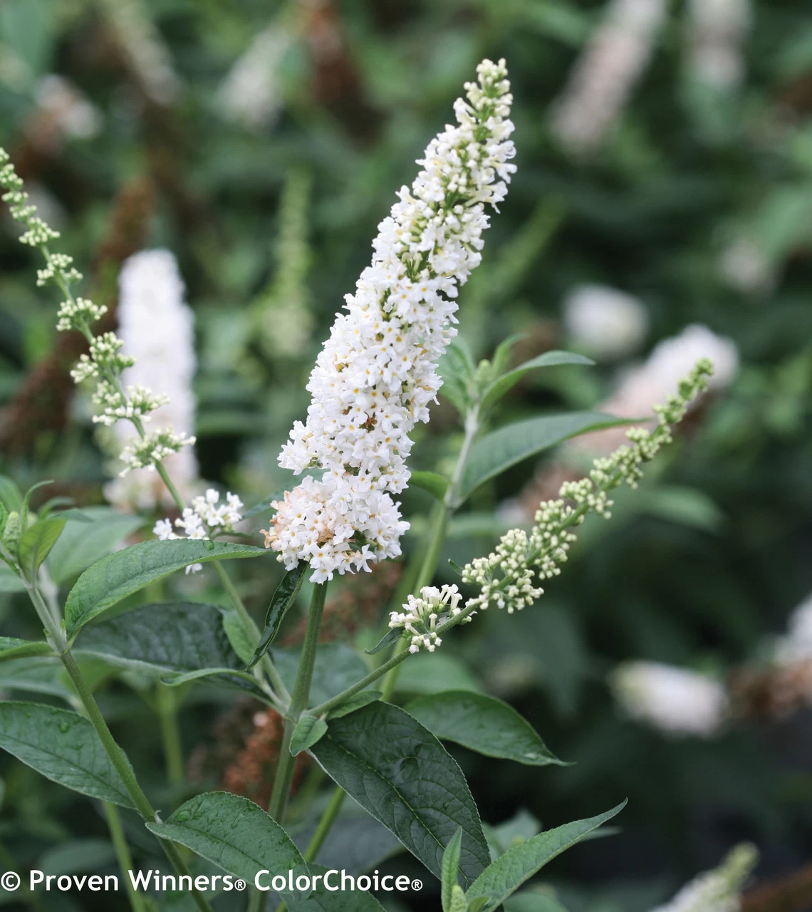 Miss Pearl Butterfly Bush is non-invasive and smaller in size than many other butterfly bush varieties. This fast-growing deciduous shrub produces long-lasting, pure white honey-scented blossoms for months during the summer into fall without deadheading. This variety was bred by Dr. Dennis Werner at North Carolina State University. This shrub is sometimes referred to as summer lilac.