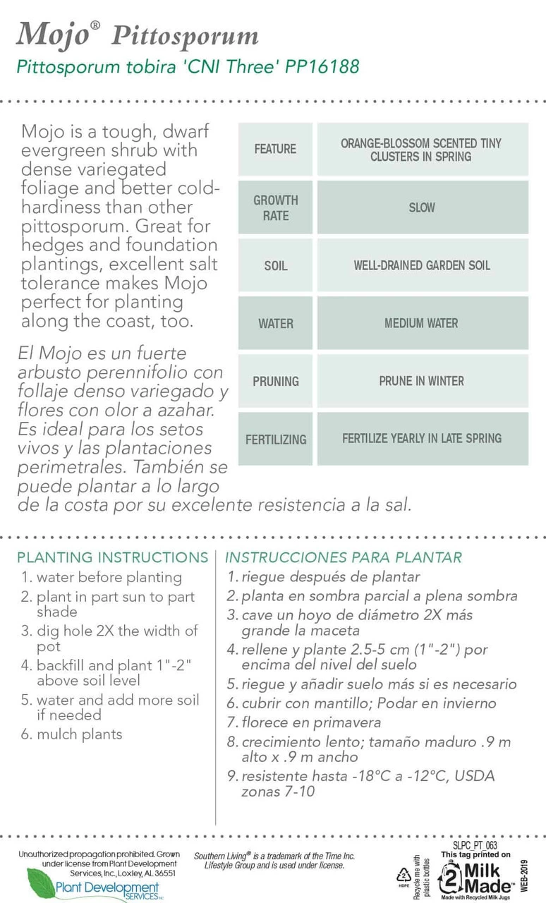 Plant Mojo Pittosporum in USDA hardiness zones 7 to 10 in well-drained soil. This plant produces creamy white flowers in the spring that have a wonderful scent similar to that of orange blossoms. Plant one near your patio, porch or a frequently used walkway to fully experience the delightful fragrance. This slow-growing compact plant will ultimately reach a height and width of 3 feet. Mojo Pittosporum is also deer resistant.