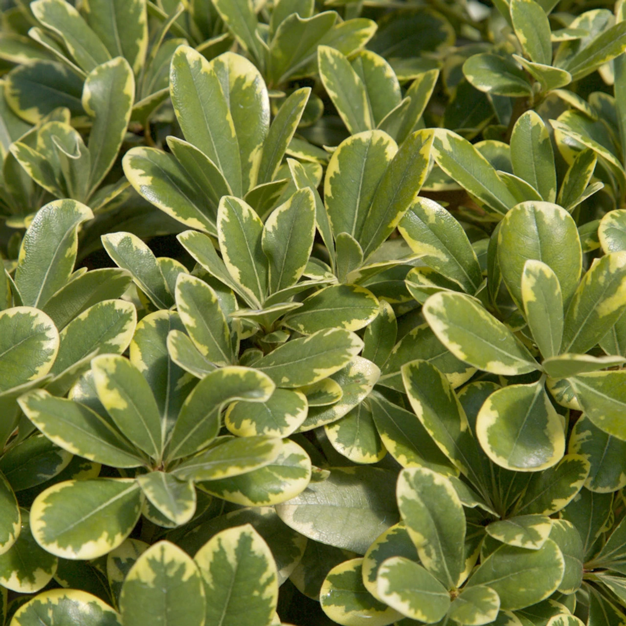 Mojo Pittosporum is a small evergreen shrub with variegated foliage. Its glossy green yellow-edged foliage will provide year-round color in a partially sunny to shady area in your landscape. Locations that receive morning sun and afternoon shade are best. Pittosporum tobira ‘CNI Three’ has a high degree of salt tolerance making it a great choice for coastal areas and along the road or winter salt-treated sidewalks.