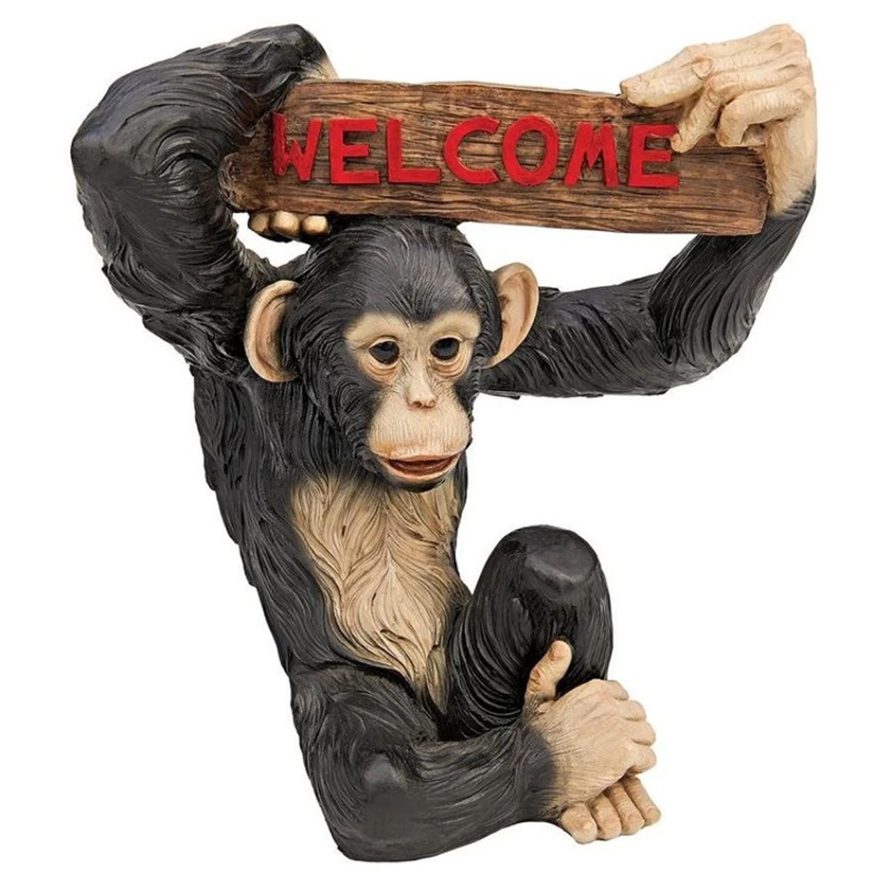 Guests will know you’re not “monkeying around” when you position this wild welcome to playfully usher them into your home or garden! Our DT-exclusive chimpanzee sculpture holds your warm greeting high in his furry monkey hands, all sculpted 360 degrees and adorable from any angle. Cast in quality designer resin and realistically hand-painted to make our monkey sculpture memorable.