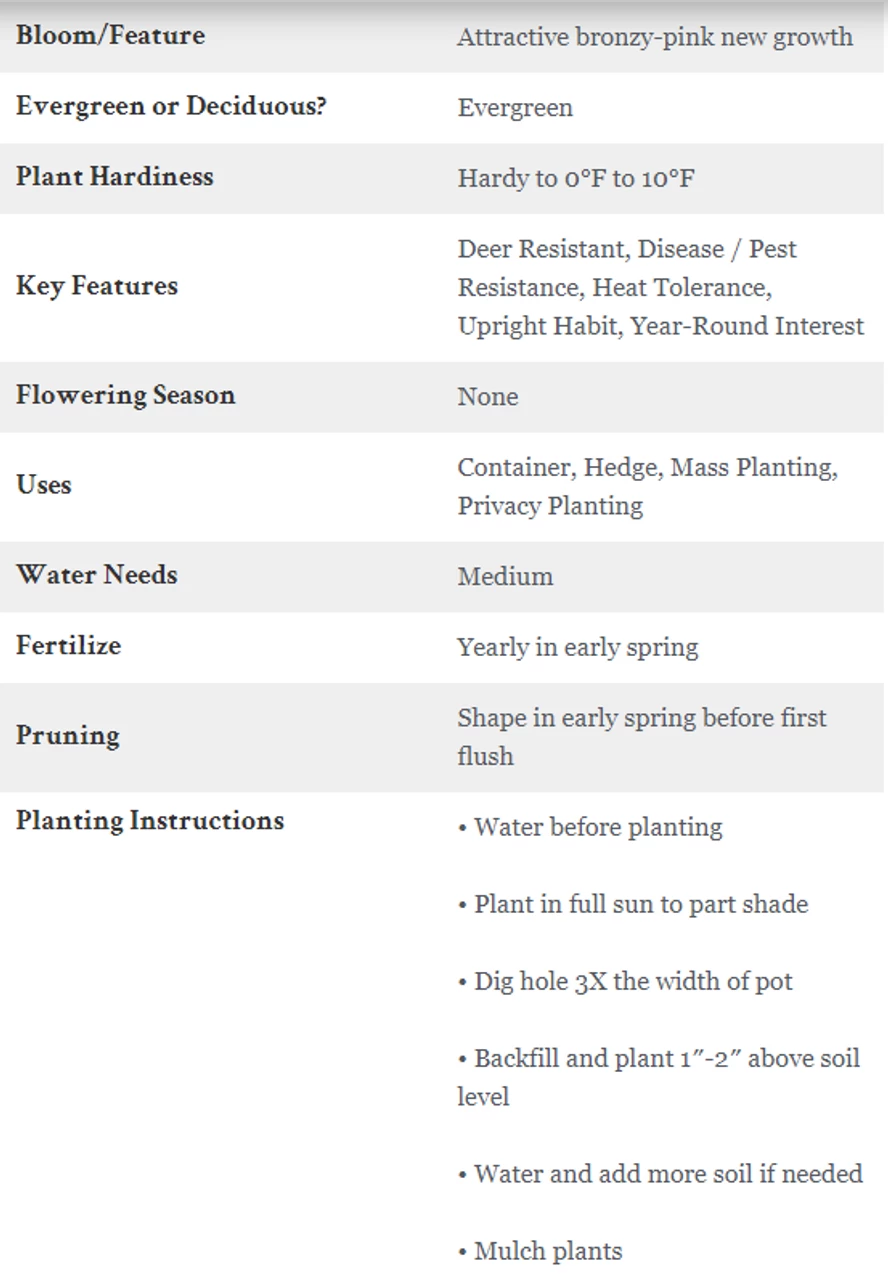| Uses: Container, Hedge, Mass Planting, Privacy Planting |