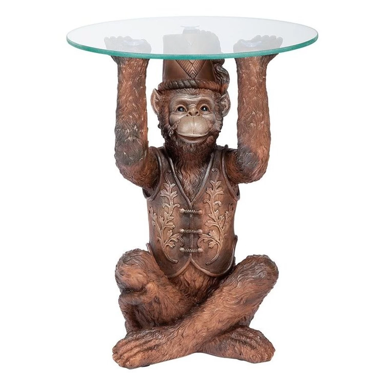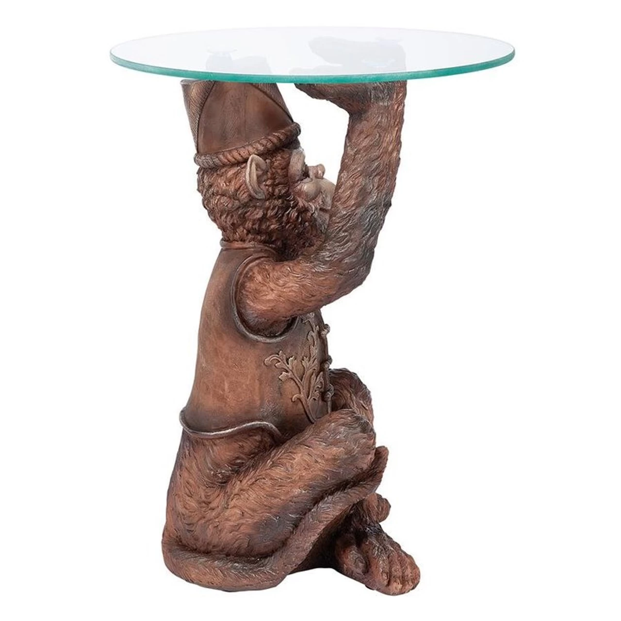 You’ll want to keep an eye on our mischievous Moroccan Monkey, always at your service beneath a 16 inch diameter glass table top perfect for juggling cocktails or any exotic fare he might serve up. You’ll admire the painstaking detail of our exclusive’s waistcoat and jaunty fez, all cast in quality designer resin for stylish display in home or garden.