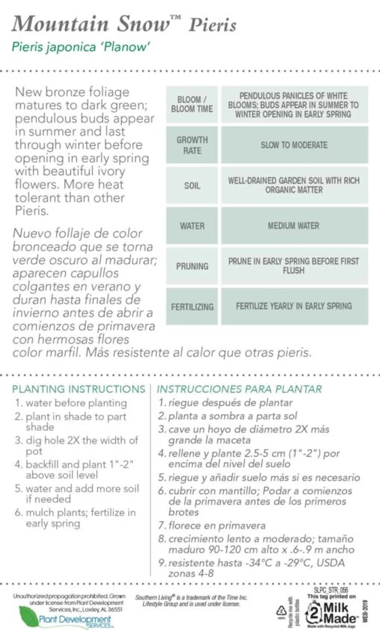 Mountain Snow, Pieris japonica ‘Planow’, is a compact, evergreen shrub with showy, white flowers in the spring. Excellent as an accent plant and for mass plantings. New growth emerges with bronze-colored foliage and matures to a deep green.
