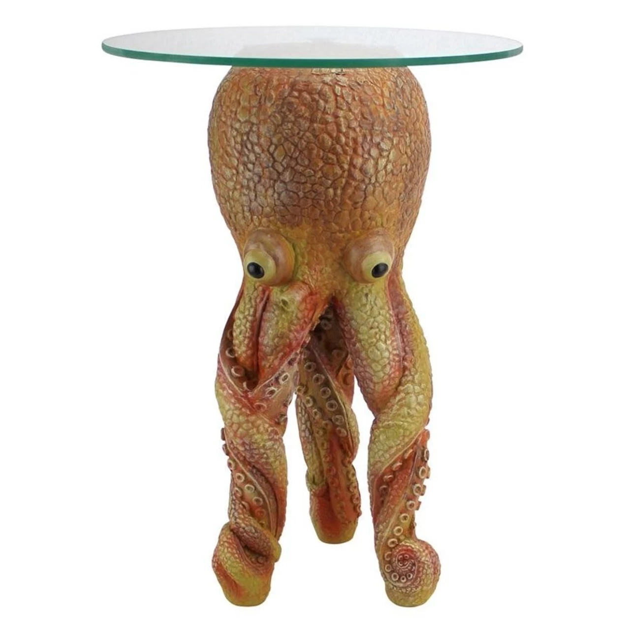 It’s Tiki time! Though an octopus is considered the smartest of all invertebrates, our Ollie is even clever enough to become the base for a quality designer resin table fitted with a 16″ diameter, â…œ”-thick, pencil-edged round glass top! Our DT hand-painted, massive mollusk lends a tropical island accent on the patio, poolside or at the spa. Another amazing exclusive only from DT!