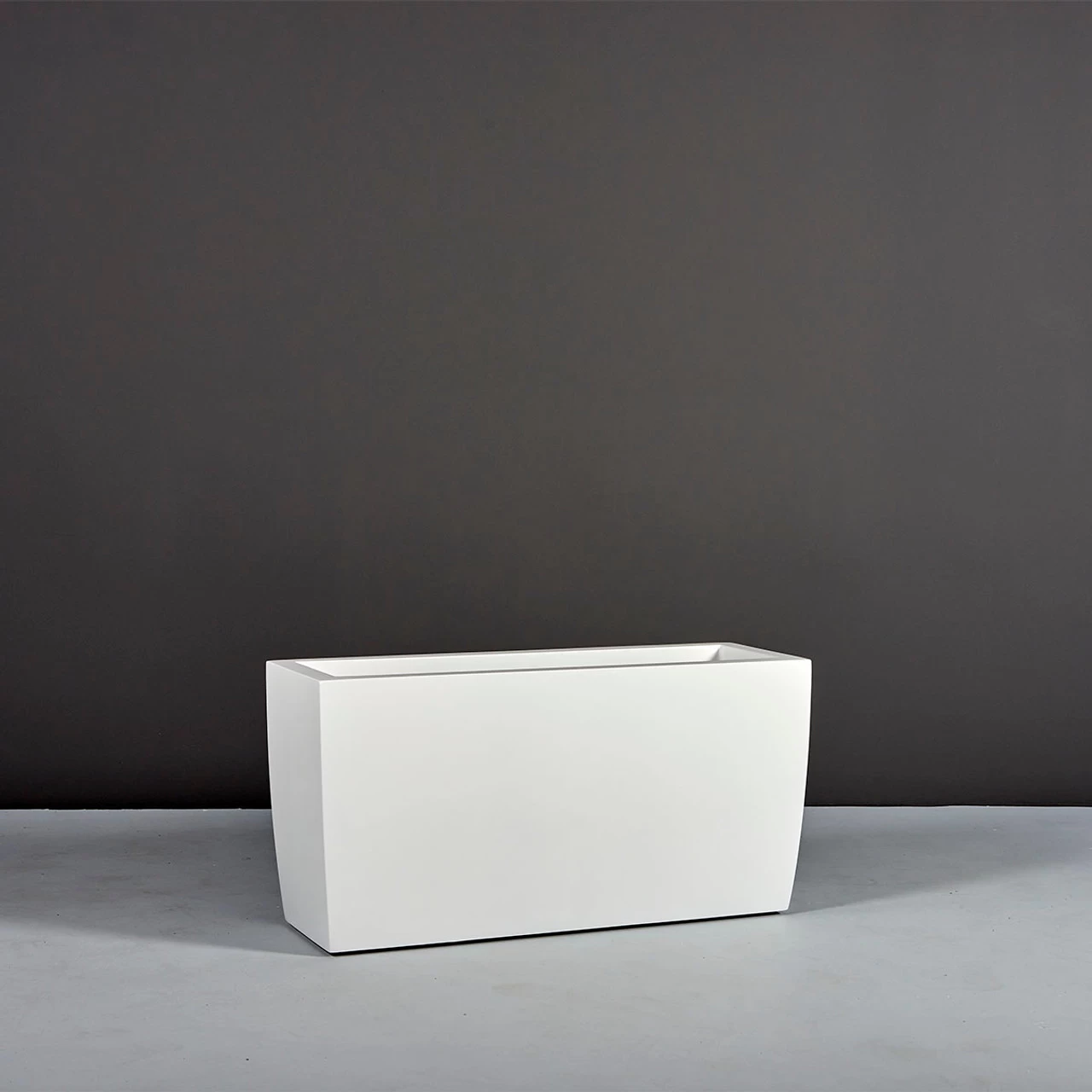 Define a space with a low hedge-like wall of greenery using the Panama Rectangular Tapered Planter. This contemporary plant container stands 18 inches tall and has a wide rectangular top that slightly tapers at the bottom. The gentle curve of the corners is a subtle contrast against the angular corners and lines of this planter. The Panama Rectangular Tapered Planters are made using high-quality fiberglass. This material creates a smooth surface that easily wipes clean with a damp cloth. These planters do not warp or rot. The material does not become brittle or fade in direct sunlight. These lightweight planter boxes can easily be moved as decor needs change or if they need to be put into winter storage.