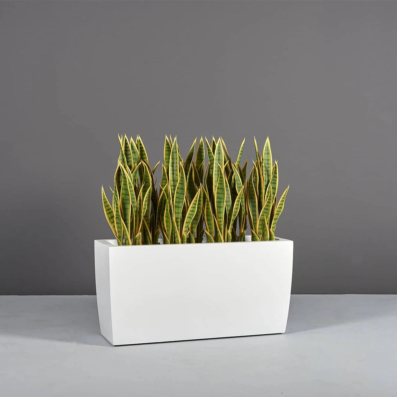 Panama Rectangular Tapered Planters from Jay Scotts are perfect for businesses and homes. The simple lines fit most decors, allowing for flexible placement options. Frame an entryway or sitting area or define a large area, like a lobby or pool deck. Create privacy on a patio or balcony. Tall plants like sansevieria (Snake Plant), and ornamental grasses extend the height of these planter boxes or create a mixed planting with trailing plants like ivy or petunias with geraniums. The matte black planters are swanky and contemporary, making them the perfect choice for ritzy retail locations, while the all white planters are crisp, cool and clean, making them ideal for indoor decorating.