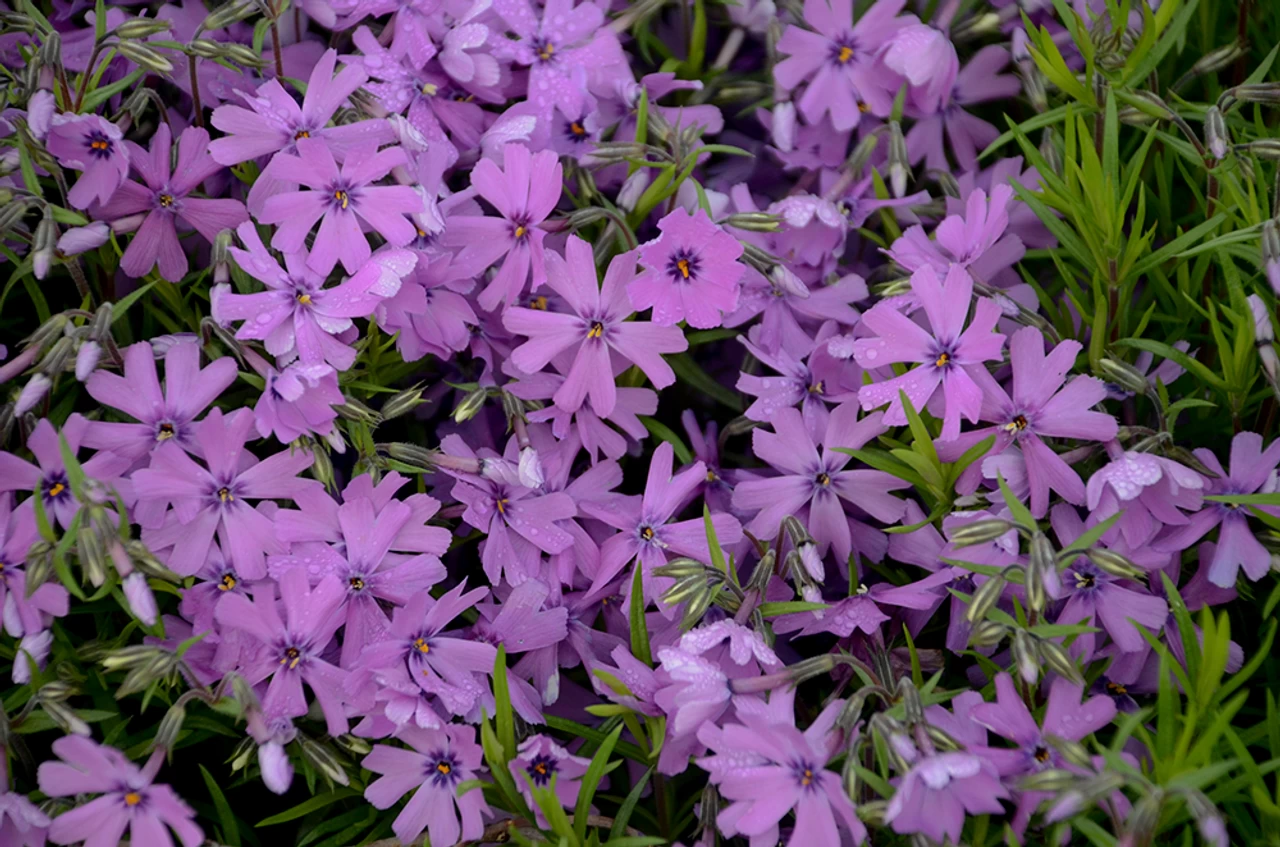 Phlox is a flowering perennial known for colorful blooms, and the Purple Beauty Moss Phlox is a wonderful and unique specimen. The star-shaped flowers are lavender in color and feature dark purple accents near the eye. The petals have an indentation on the outer edge that resembles a heart shape. Narrow, green foliage provides a consistent backdrop for the beautiful flowers.