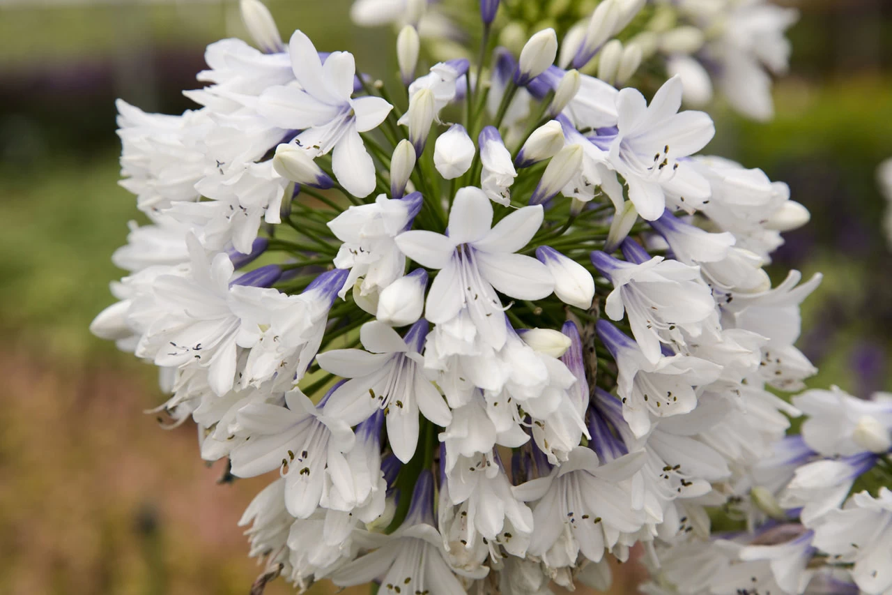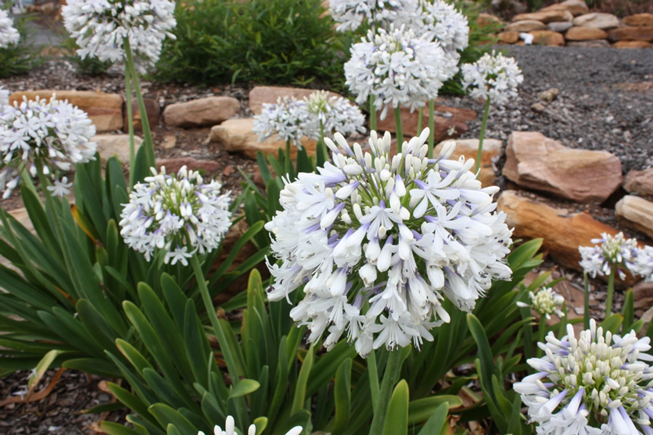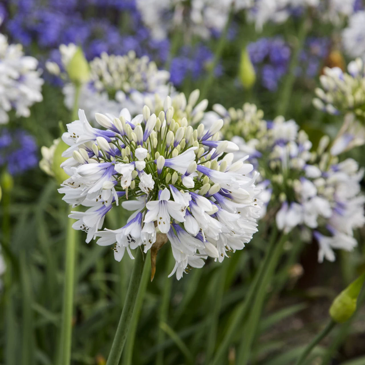 Are you looking for a tough plant that puts on a show? The Queen Mum Agapanthus is just what you need. The clusters of white blooms with blue bases sit on tops of the green foliage. It is a plant that is extremely adaptable. This fast grower will suit any container and look fantastic when mass planted.