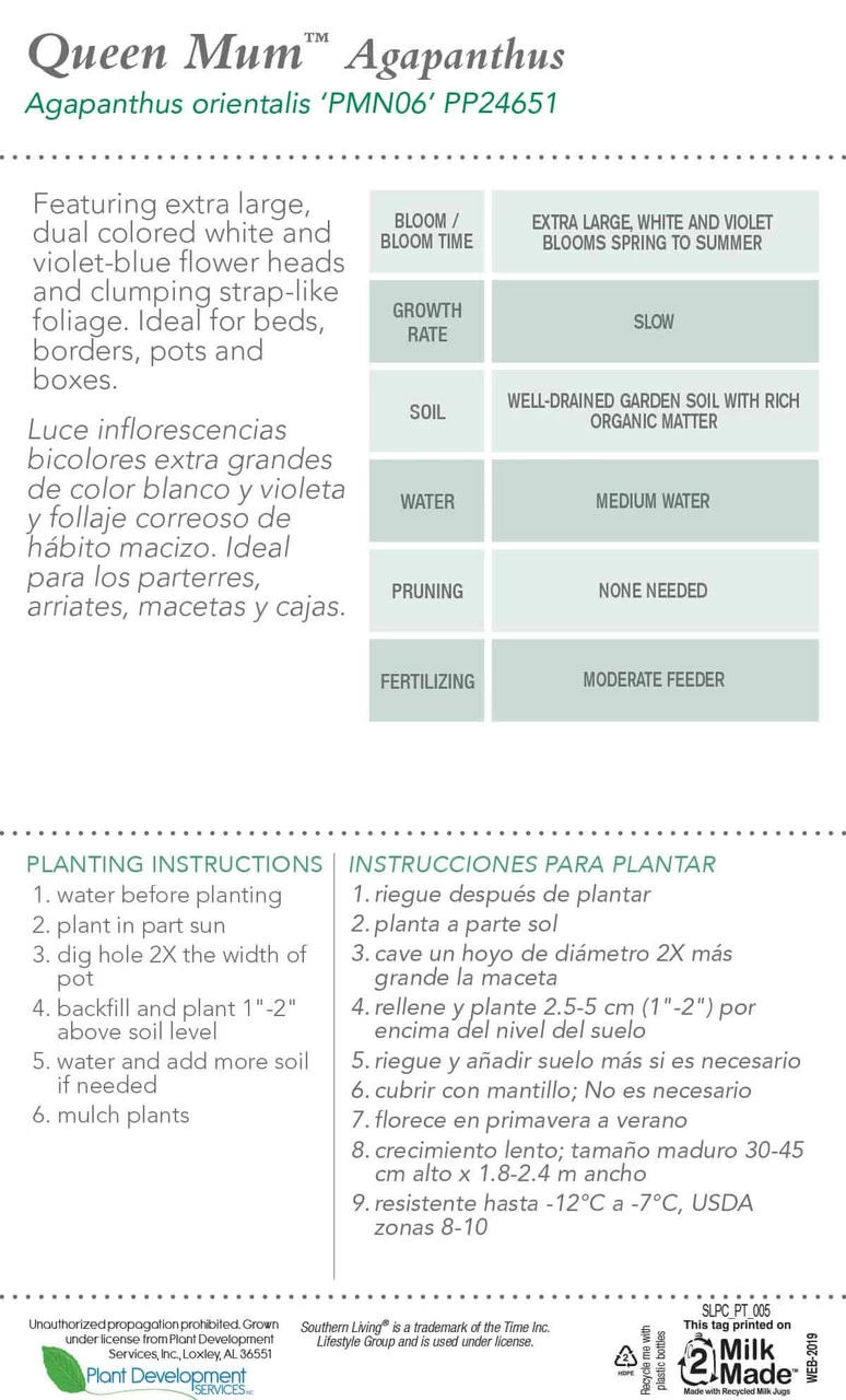 When spacing your Queen Mum Agapanthus be sure to space at minimum two feet, center on center. If container planting is desired, be sure to use a five to seven gallons size.