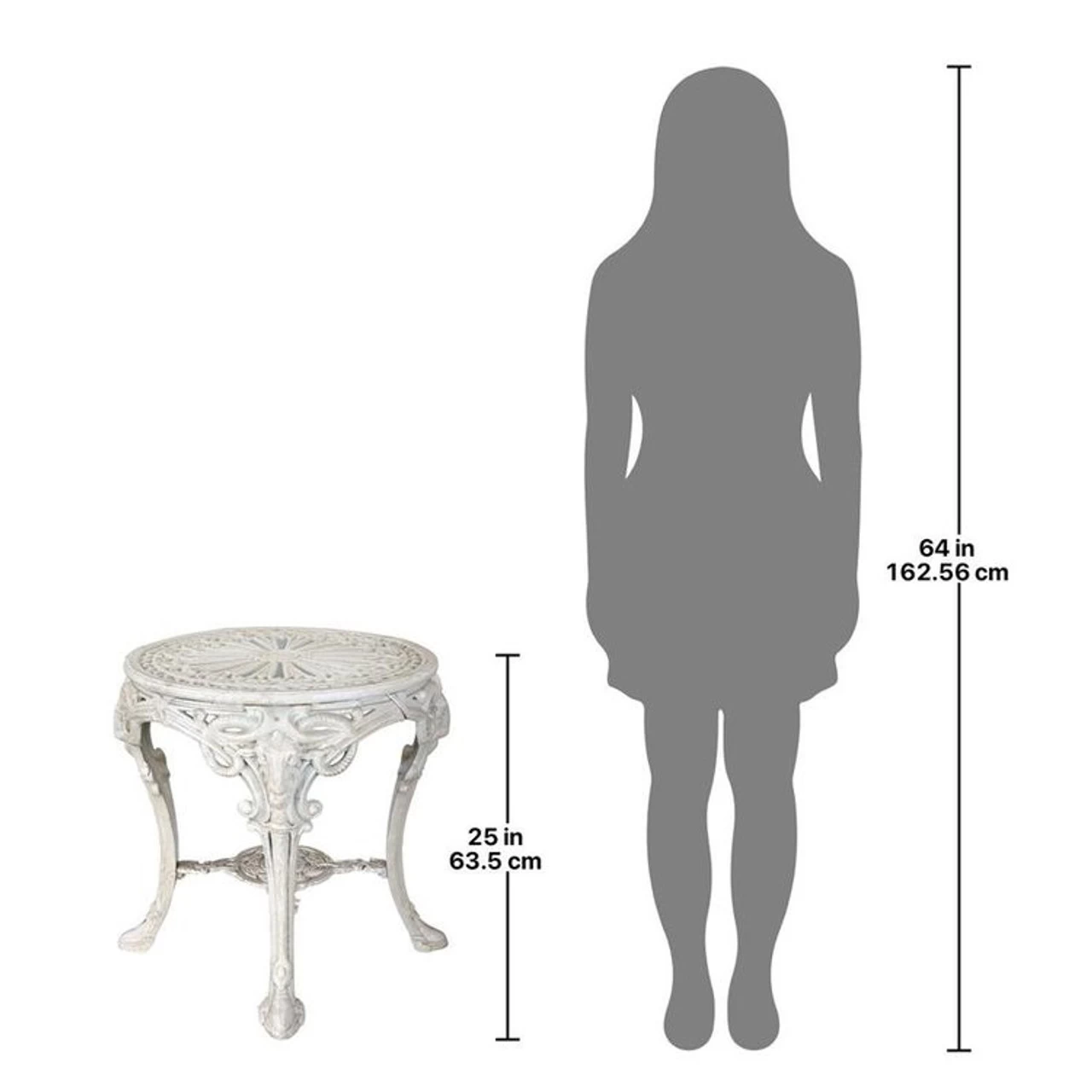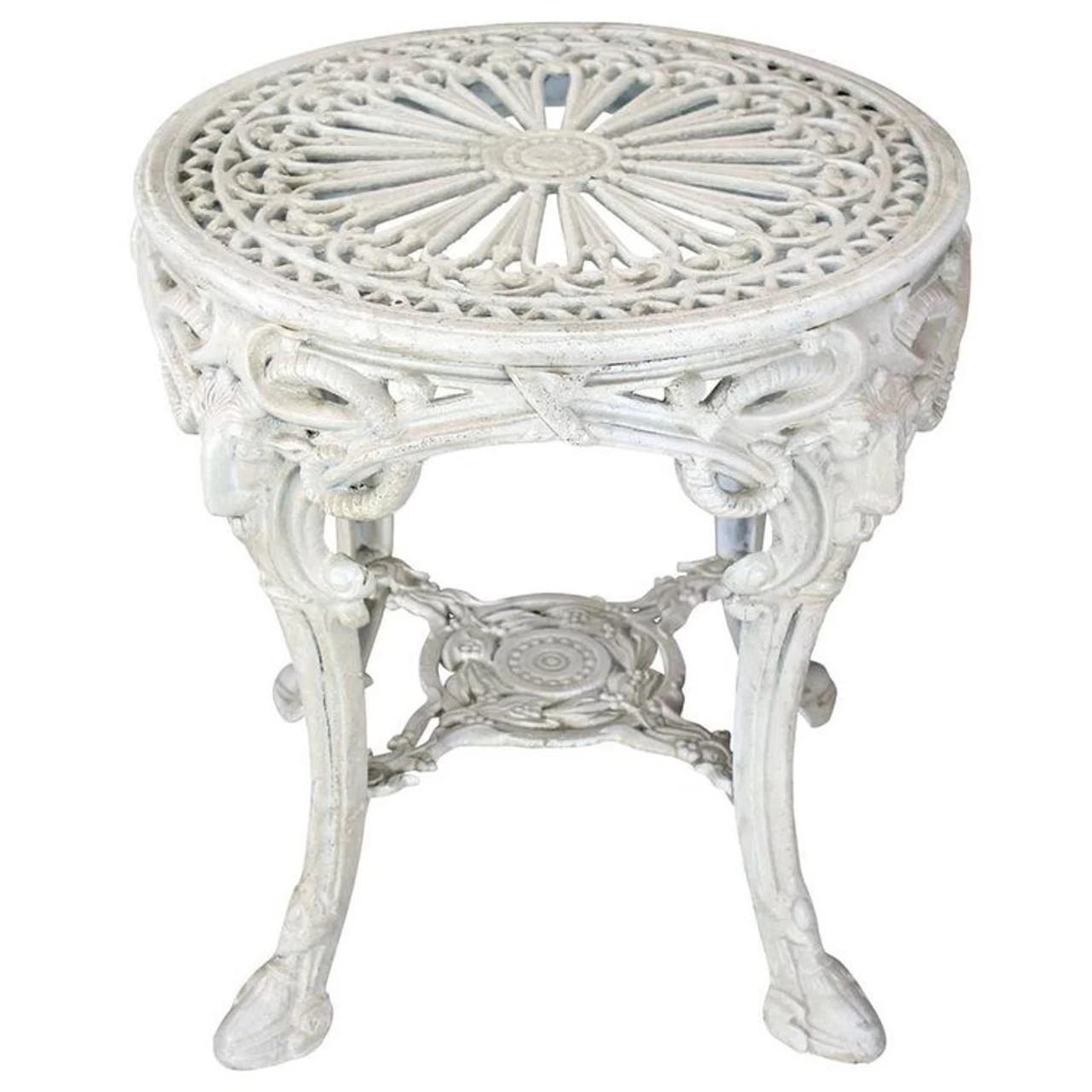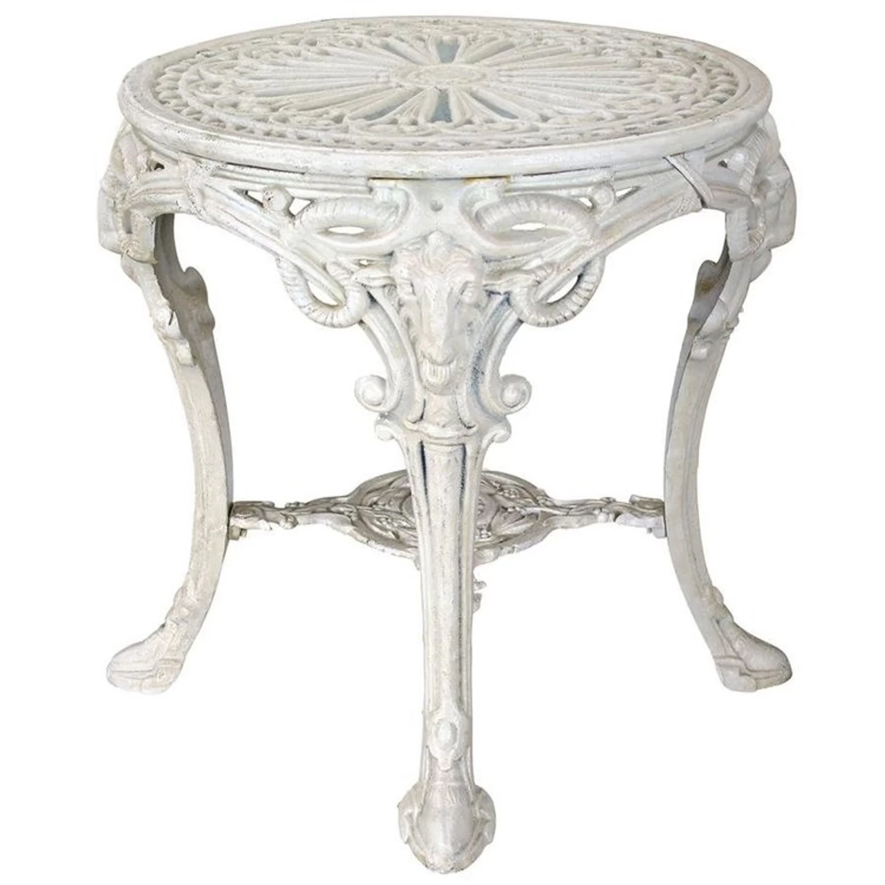No proper Victorian home would have been without this traditional foundry iron cast garden table. Unlike the lightweight aluminum models youÂ’ll see in local garden stores, ours is heavyweight iron inspired by a Victorian antique. Our 23-inch diameter table with classic ram motif legs reminds us that the exquisite details on this exclusive work hail from an era when quality iron work was high-style decorative art.Simple assembly required. 23½”dia.x25″H. 90 lbs.