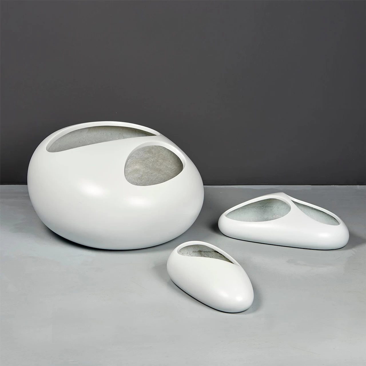The small River Rock Planter has smooth curves similar to the tumbled edges of river rock. A single tear-drop-shaped opening mimics the organic, natural shape of the planter. This fiberglass planter can be used outdoors or inside for flexible placement options. The material is weather resistant and will not warp, rust, fade or rot. This planter is available in a wide array of colors, from natural-hued neutrals to vivid shades. You can also order a custom color to coordinate this planter with your branding or existing decor. Additional time and fees apply to custom colors; the orders cannot be canceled or returned.