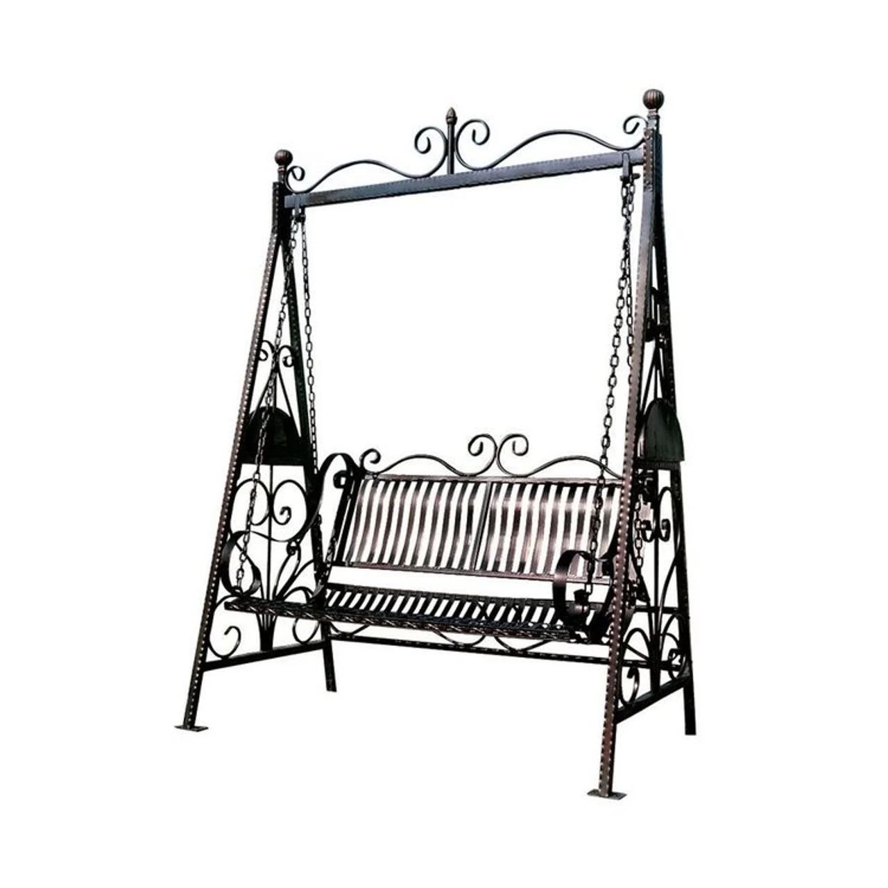 If youÂ’ve always longed for a traditional double swing, yet lacked either the front porch or the old apple tree from which to hang it, our garden swing is just for you! Imagine yourself and a special someone relaxing in barefoot comfort against the contoured back of our stable, quality tubular steel A-frame swing. Beautifully ornamented with rosette details, it is durably built with a lustrous, chocolate brown, rust-resistant powder-coated finish to withstand many seasons. Its bracketed feet allow for optional permanent installation. Simple assembly required.