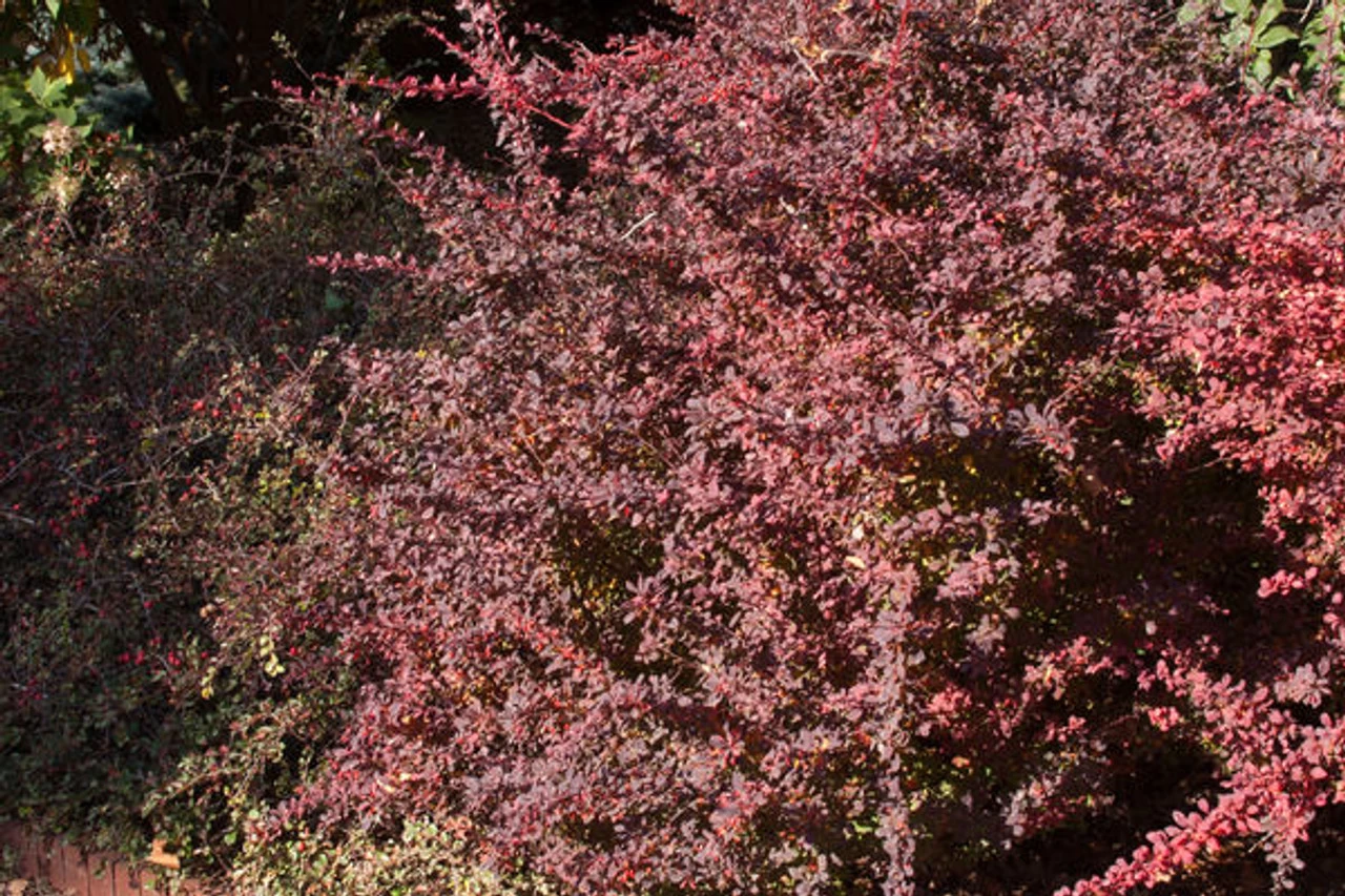 Enjoy a natural but dramatic red hedge with Rose Glow Japanese Barberry. Place each shrub just under 4 feet apart from center to center to give them room to eventually grow together.
