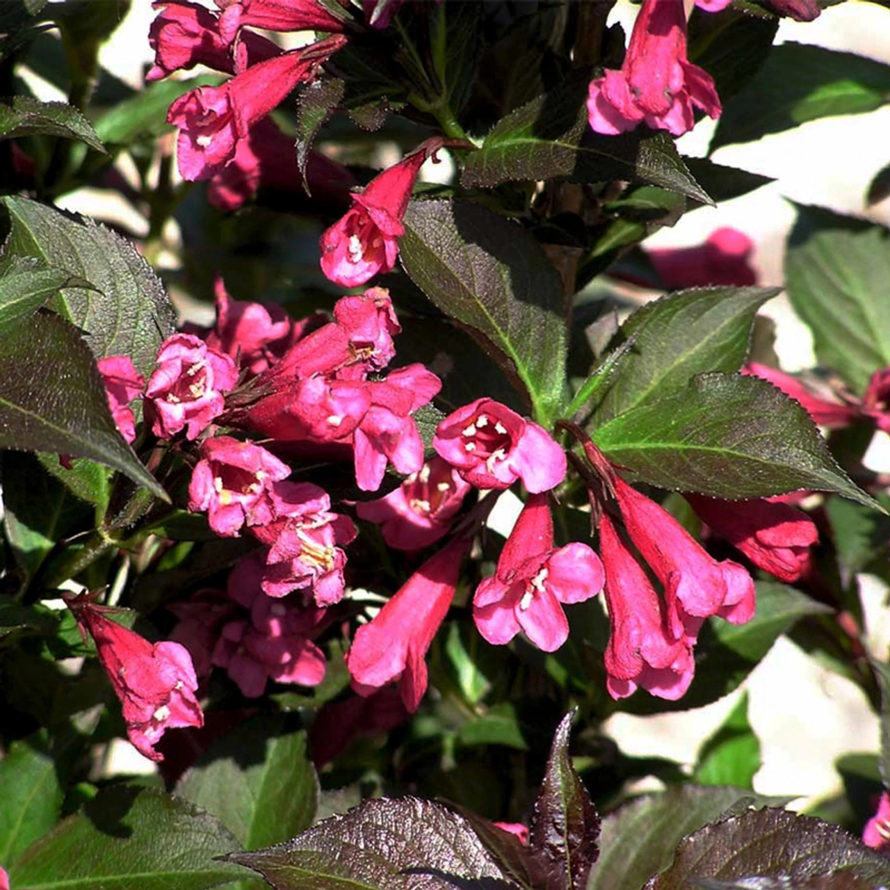 Shining Sensation Weigela gives your landscape color contrast in one pretty package. Each spring, trumpet-shaped flowers emerge that are hot pink and plentiful. They form against the backdrop of deep red to maroon leaves. The dark leaves are shiny, adding to the texture and garden interest of this weigela. Birds and butterflies flock to the hot-pink blooms.