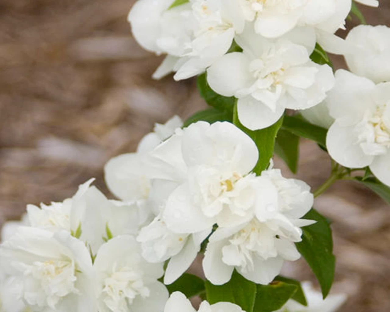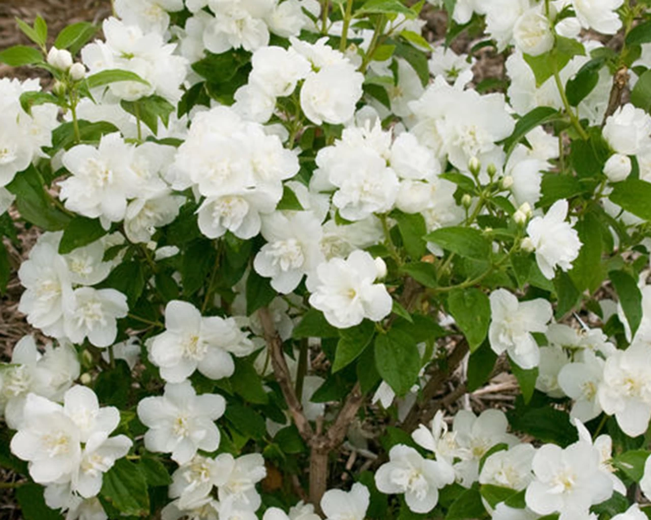 Mockorange shrubs are some of the most loved flowering bushes of spring. With a scent resembling oranges and snow white double blooms, Snow White Mockorange (Philadelphus) will delight as a classic garden plant. Their highly aromatic flowers attract early pollinators and are lovely additions to a floral arrangement. Flowers first appear in late spring, with another flush in late summer. Snow White™ is more tolerant of heat and humidity, and the foliage remains fresh until the first frost in the fall. The fully double-white flowers cover the length of the branches. The fountain shape provides foliage to the ground, so there is less need to plant perennials or other plants in front as cover for bare stems.